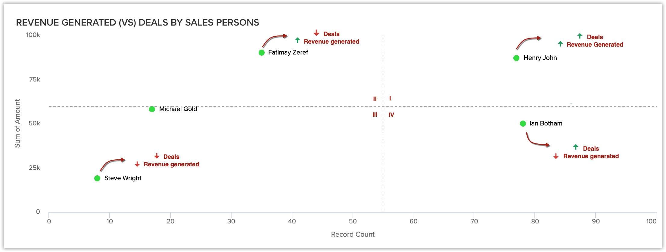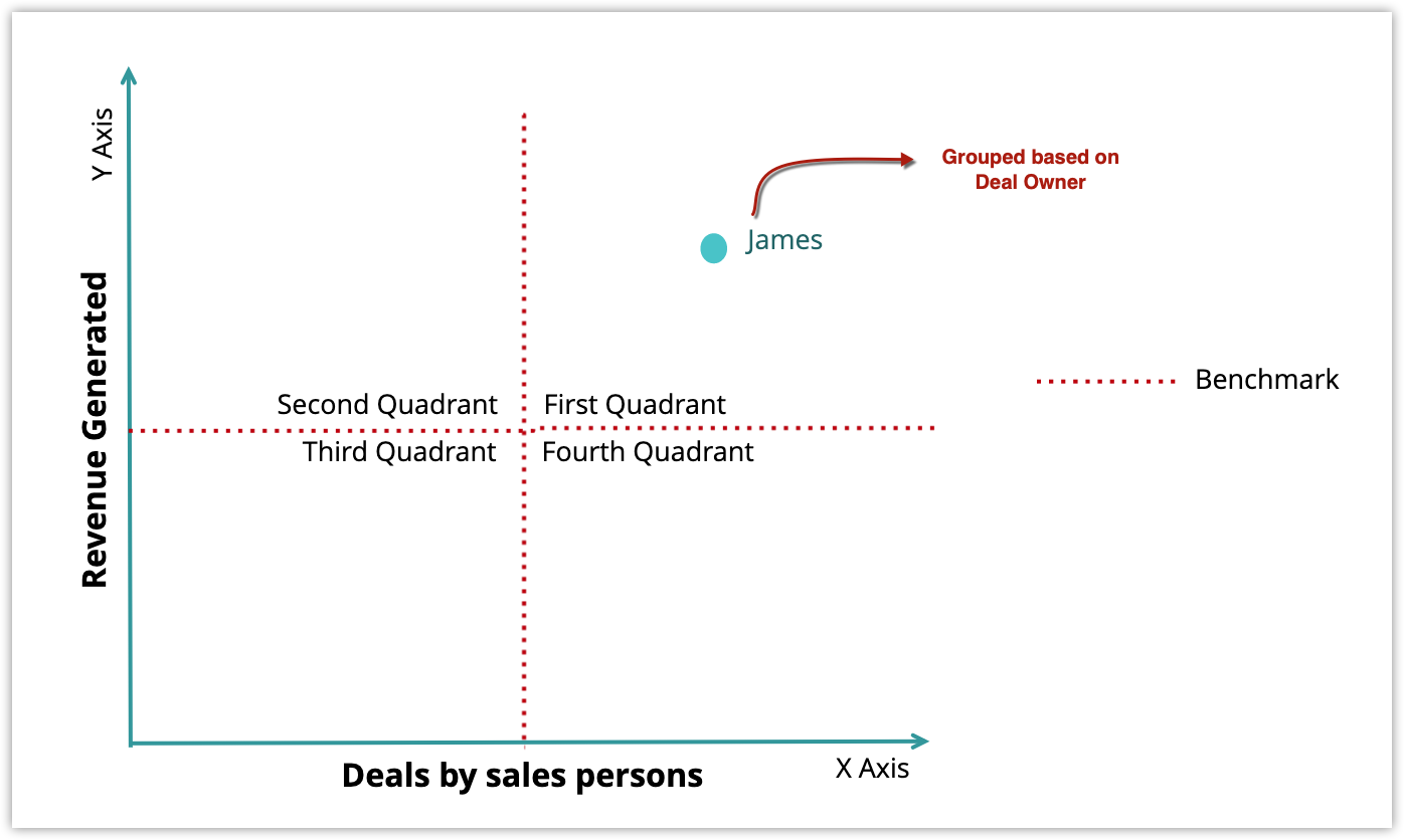 Din acestea, poți deduce că agenții de vânzări din cadranele unu și doi au performanțe mai bune decât cei din cadranele trei și patru.