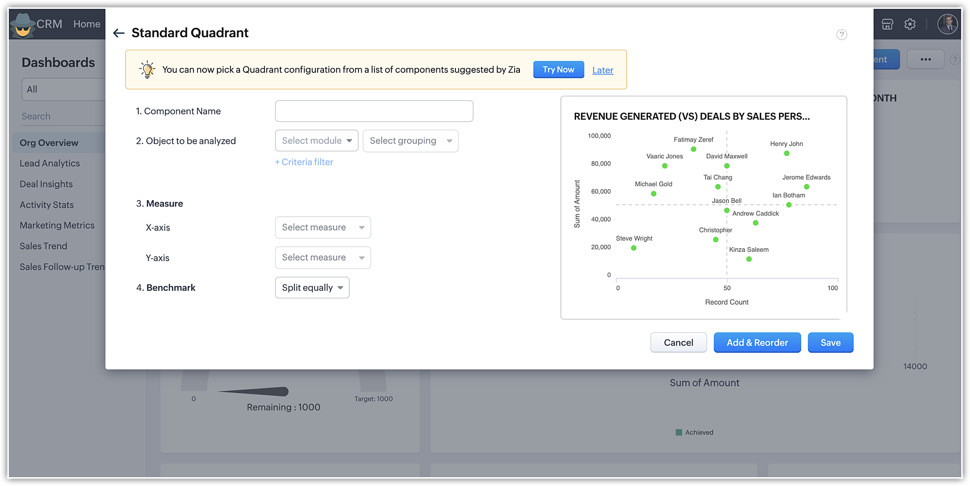 Recomandările avansate ale Zia pot fi folosite pentru a construi diferitele elemente ale tabloului de bord analitic. Aceste recomandări sunt generate prin examinarea rapoartelor și graficelor utilizatorului. Zia va analiza datele tale și va oferi sugestii de top pentru componentele analizei cadranelor care se aliniază cu nevoile organizației tale și cu procedurile de afaceri.
