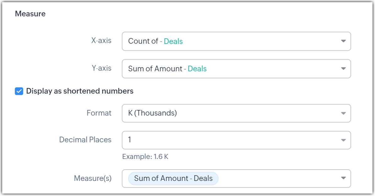 - Dacă vrei ca numerele mari să fie afișate într-un format prescurtat, activează Display as shortened numbers. Setează formatul, selectează zecimalele și alege metricile care trebuie afișate în acest mod.