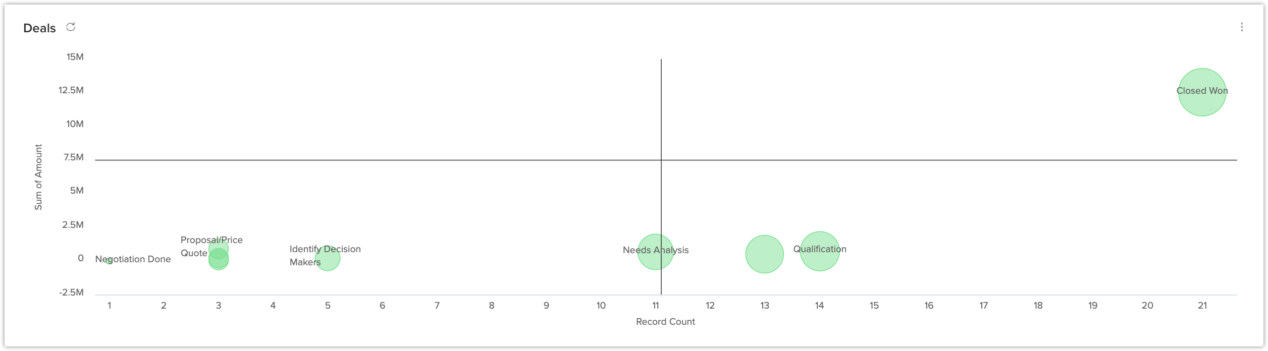 Analiza cadranelor distribuie datele pe care vrei să le analizezi sau să le măsori în patru cadrane. Poți analiza date precum tipul de campanii versus veniturile generate pentru a identifica campania cea mai eficientă sau lead-urile create versus sursa lead-urilor pentru a identifica sursa din care obții mai multe lead-uri pentru companie.