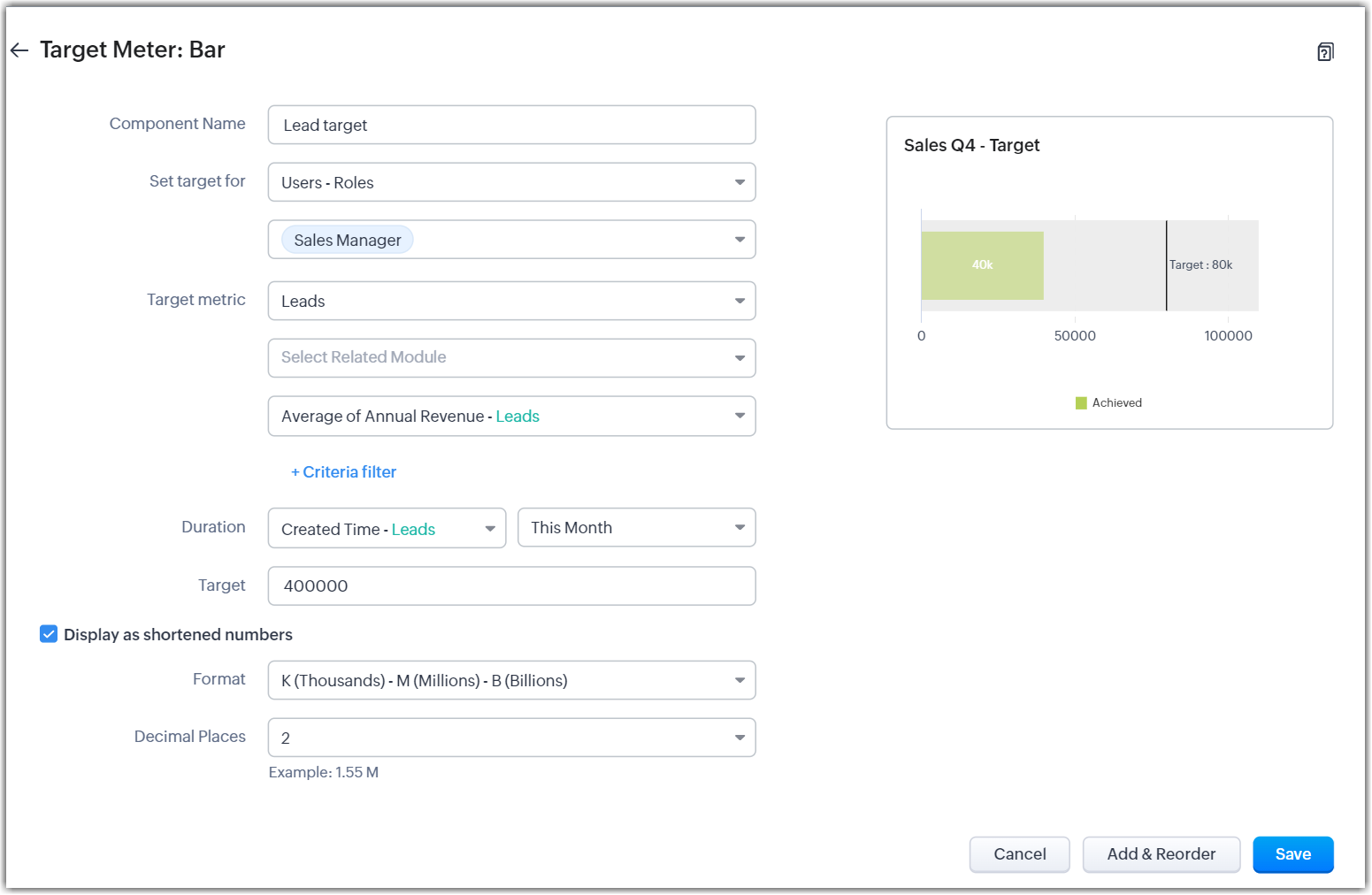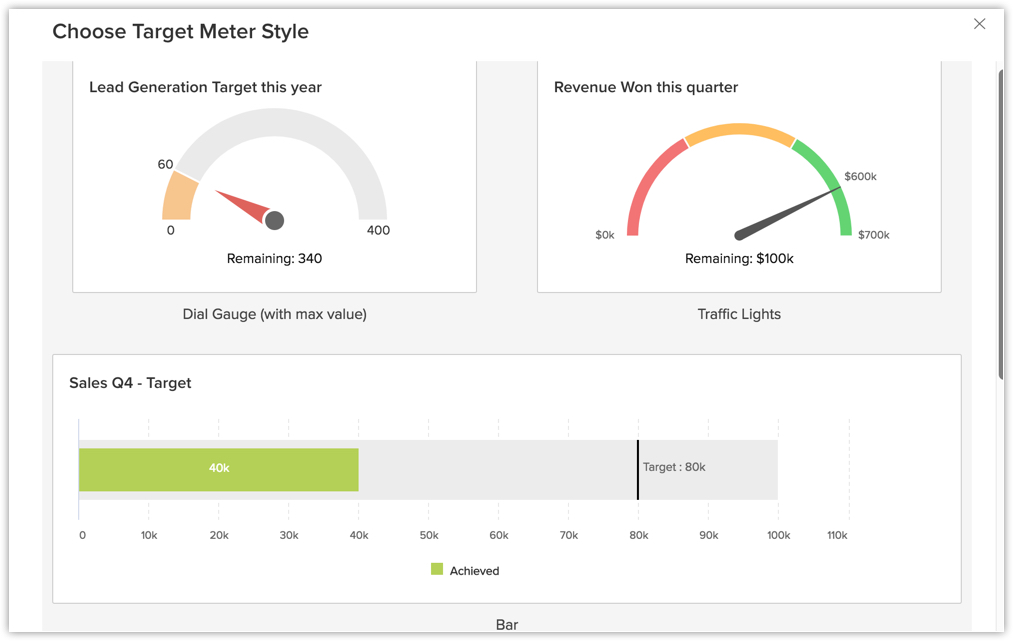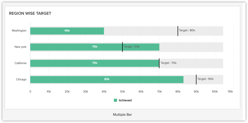 Fila Dashboards este redenumită Analytics pentru anumite conturi.Să luăm un exemplu pentru a înțelege mai bine. Să spunem că Zylker Inc. dorește să stabilească ținte pentru o perioadă de șase luni pentru fiecare regiune și să urmărească orice decalaj care ar putea apărea. Pot alege stilul de contor de target cu bare multiple și să seteze ținta pentru managerii de vânzări. În plus, pot seta și ținte individuale pentru fiecare manager de vânzări în cazul în care venitul așteptat variază pe regiuni. Aceste date vor oferi o imagine completă și mai clară a țintei stabilite pentru fiecare regiune sau individ și a țintei atinse.