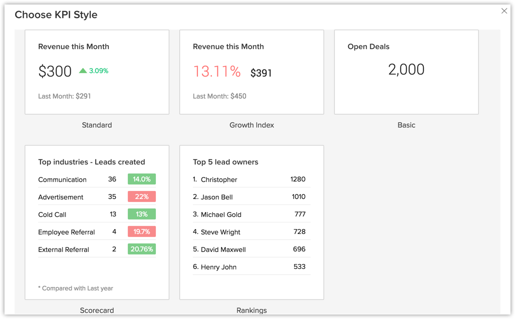 În funcție de cerințele industriei tale, poți alege dintre cinci tipuri diferite de stiluri KPI: