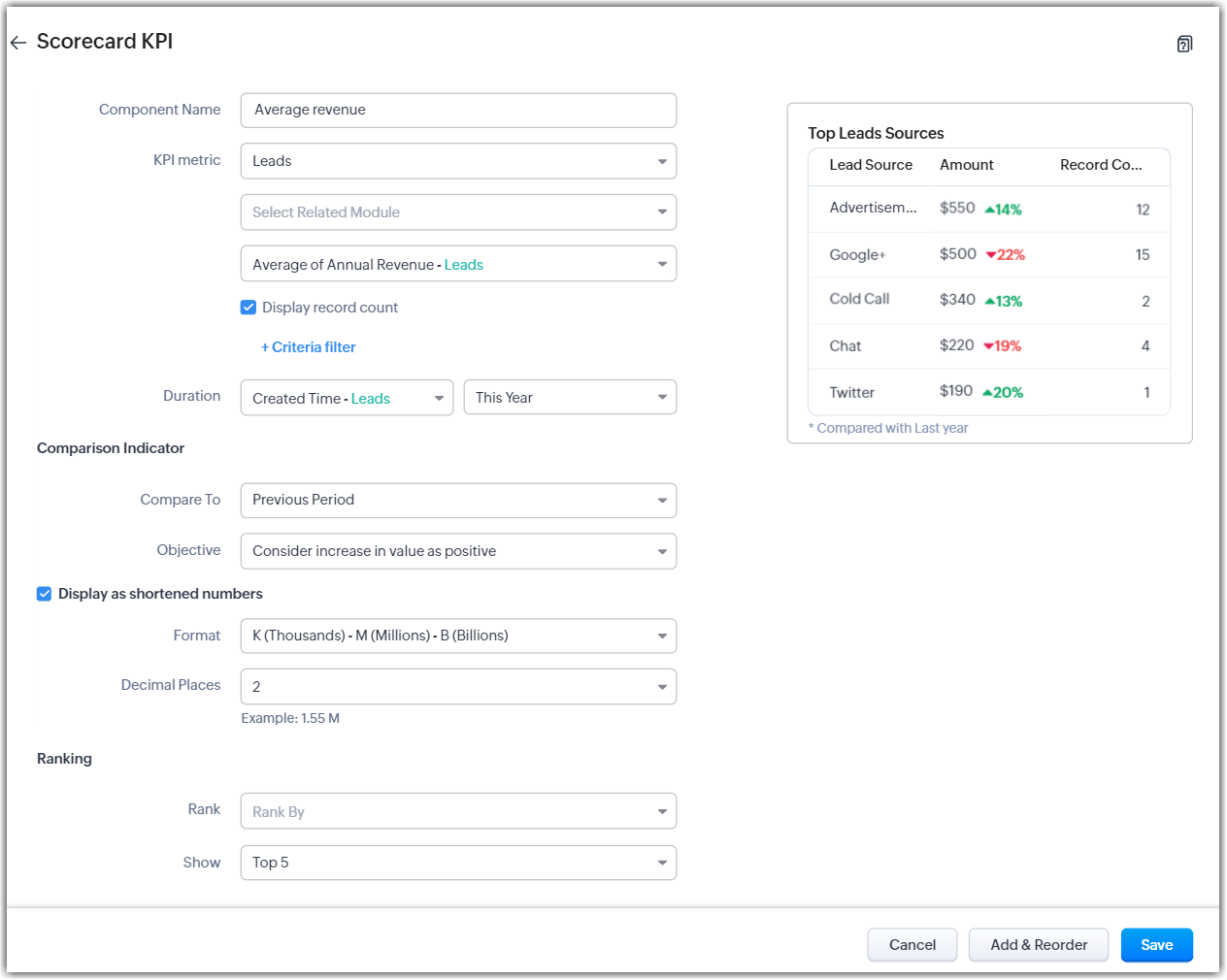 Fila Dashboards este redenumită Analytics pentru anumite conturi.Indicatorul Cheie de Performanță (KPI) este o măsurătoare standard care demonstrează eficiența echipei tale de vânzări în atingerea obiectivelor importante de afaceri; oferă, de asemenea, analize utile pentru a ajuta personalul de vânzări să își crească productivitatea prin măsurarea periodică a performanței. De exemplu, un manager de vânzări dorește să monitorizeze primii 10 reprezentanți de vânzări în funcție de venitul anual mediu obținut de fiecare. Poate realiza cu ușurință acest lucru creând un KPI de tip clasament, definind venitul anual mediu ca metrică KPI.