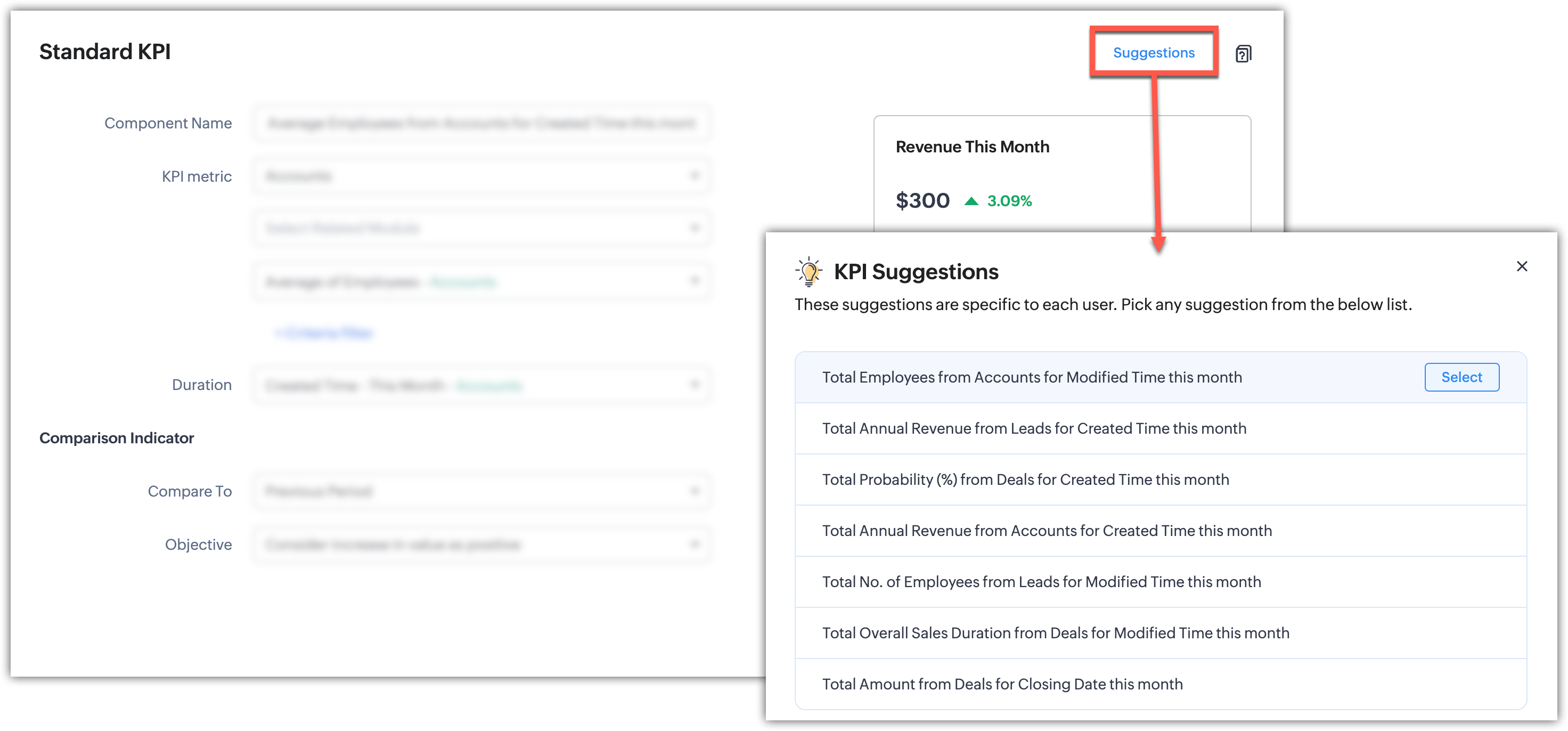 - Selectează o metrică KPI și un modul asociat din lista derulantă.