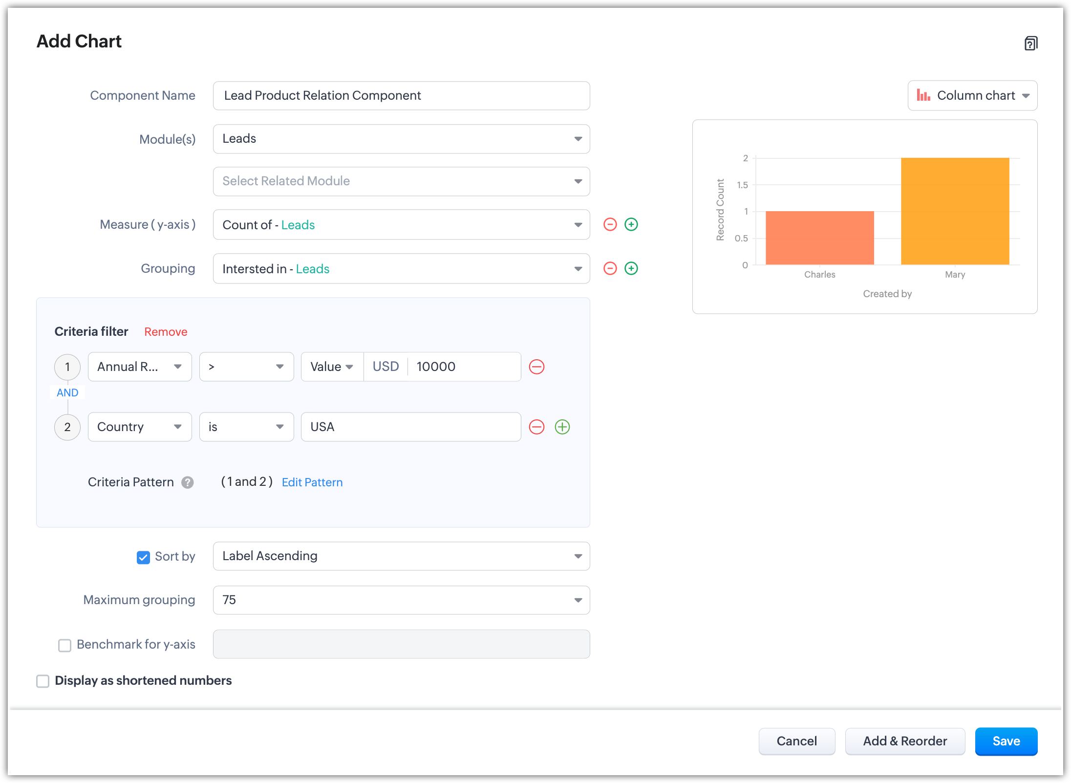 Această opțiune este disponibilă când gruparea selectată este un câmp de tip picklist sau numeric. Află mai multe. - Fă clic pe Criteria Filter pentru a specifica în continuare criteriile de filtrare a înregistrărilor.