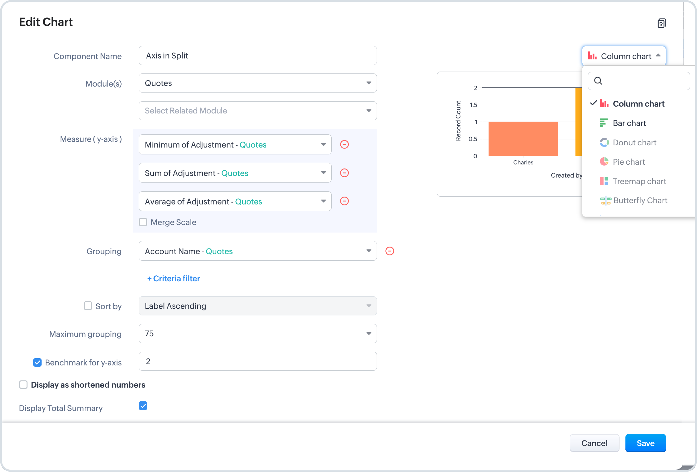 Această opțiune este disponibilă când gruparea selectată este un câmp de tip picklist sau numeric. Află mai multe. - Fă clic pe More Options pentru a alege Sort by, Maximum grouping, Benchmark for y-axis și Display as shortened numbers, Display Total Summary pentru a afișa totalul valorilor participante (sumă sau cantitate) ca referință rapidă.