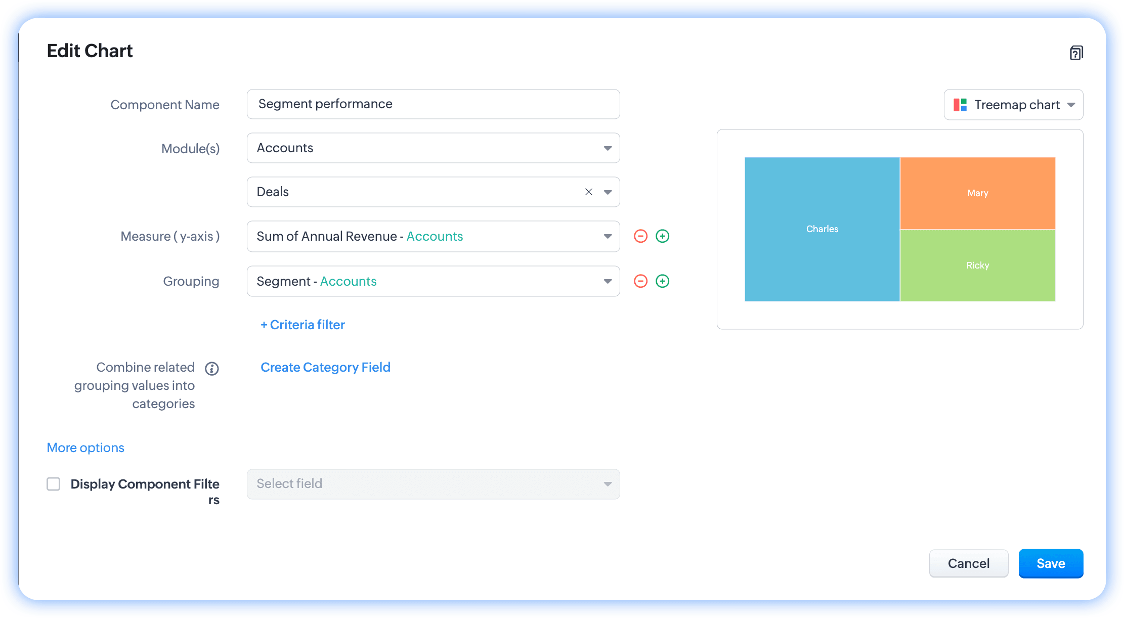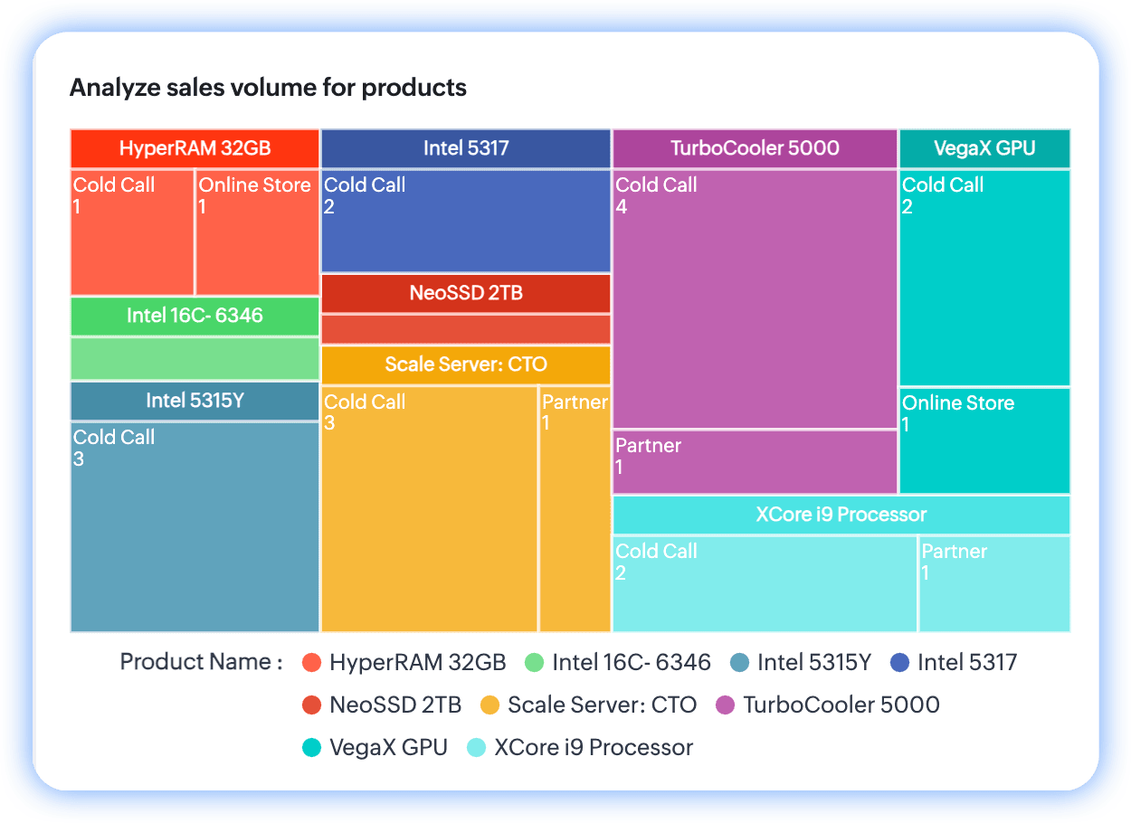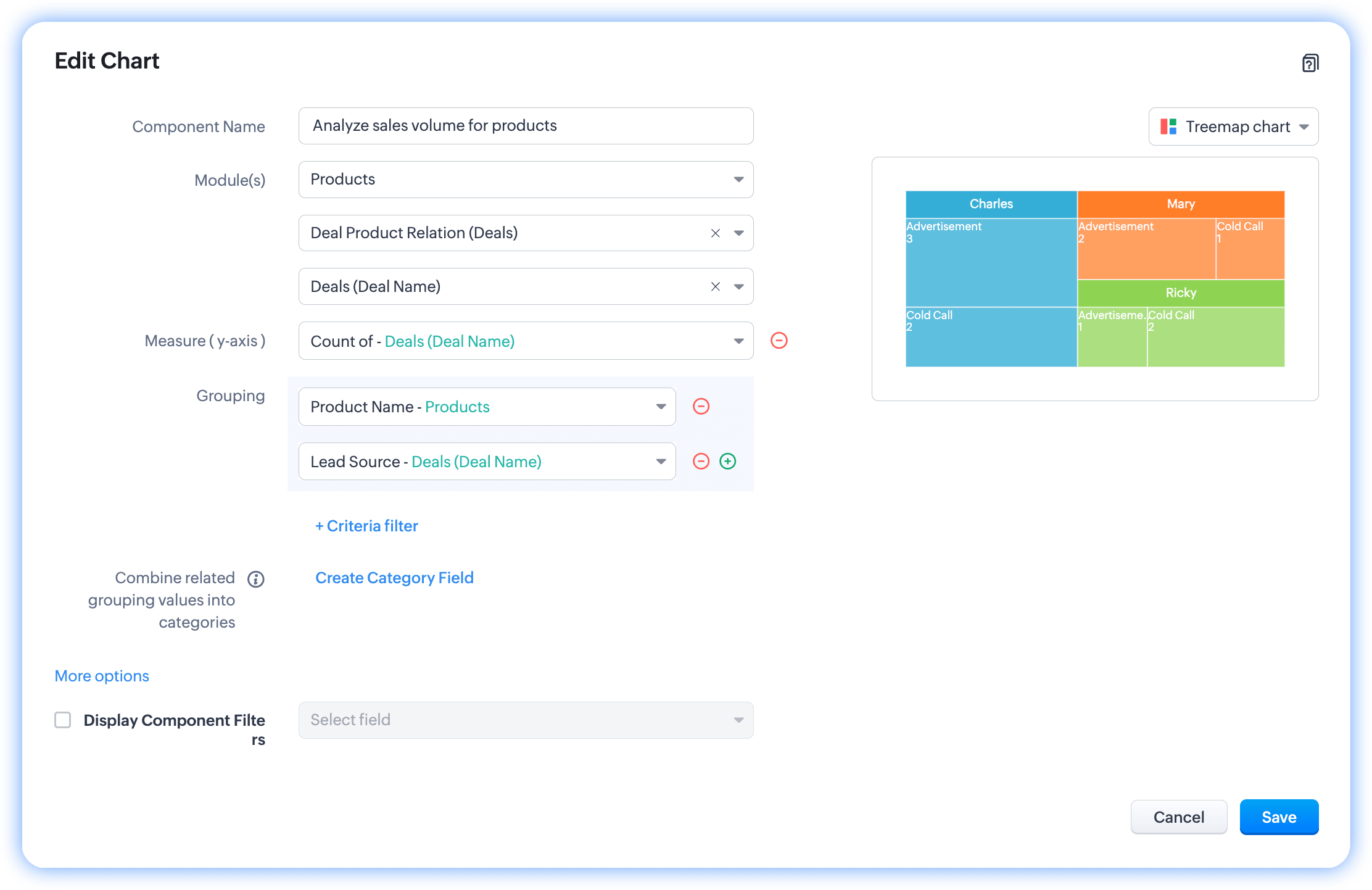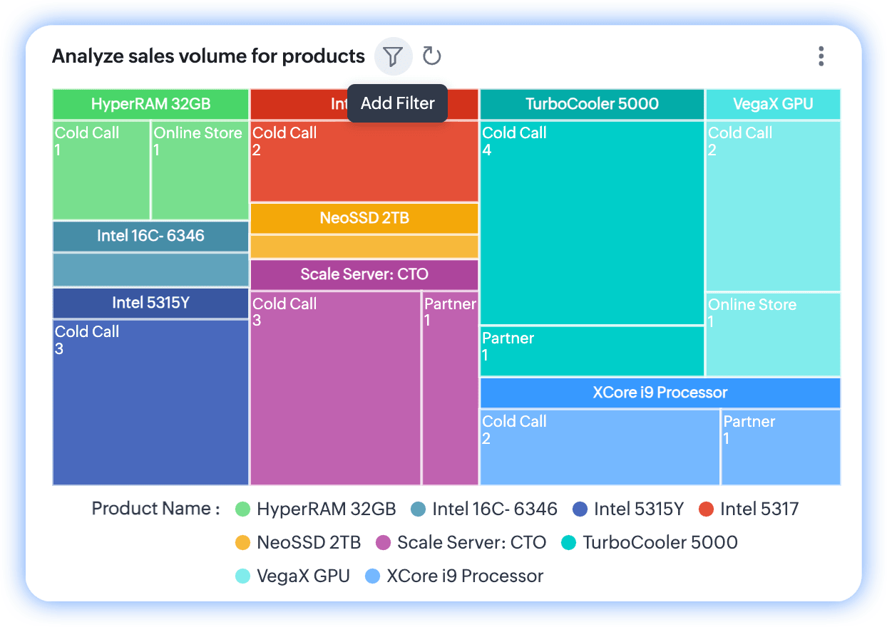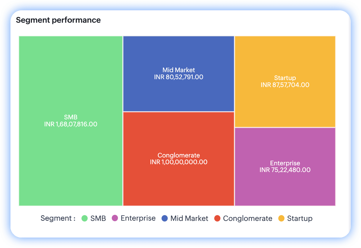 Notă: Poți folosi date cu până la două grupări pentru a construi grafice treemap în Zoho CRM.