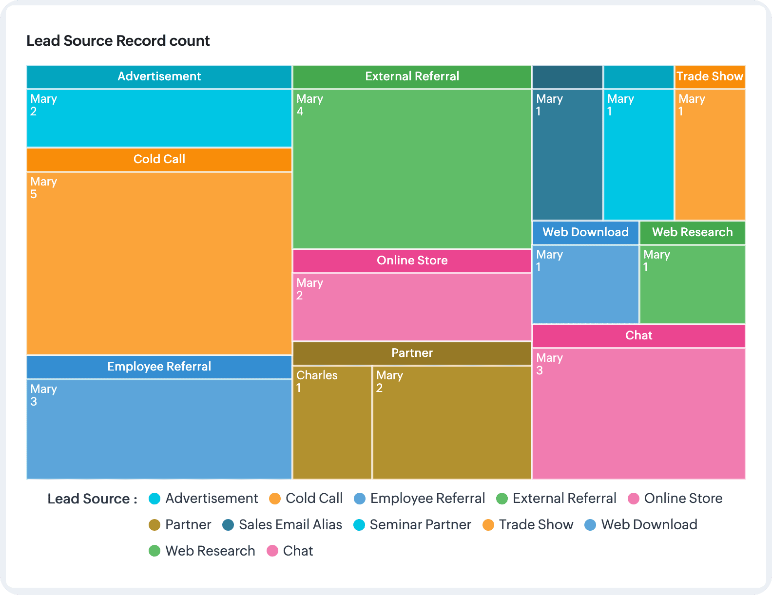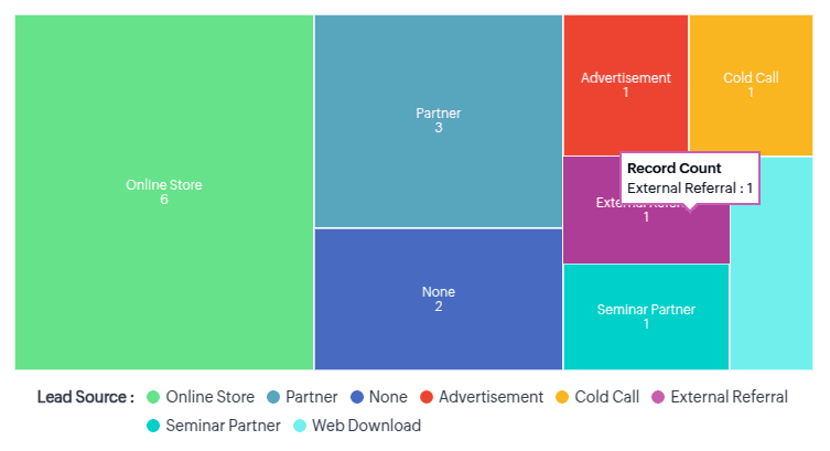 De exemplu: Mai jos este un grafic treemap care reprezintă o listă de surse de lead-uri și le compară pe toate dintr-o privire. Acesta este un treemap cu o singură grupare, adică folosește un singur nivel de date pentru analiză.