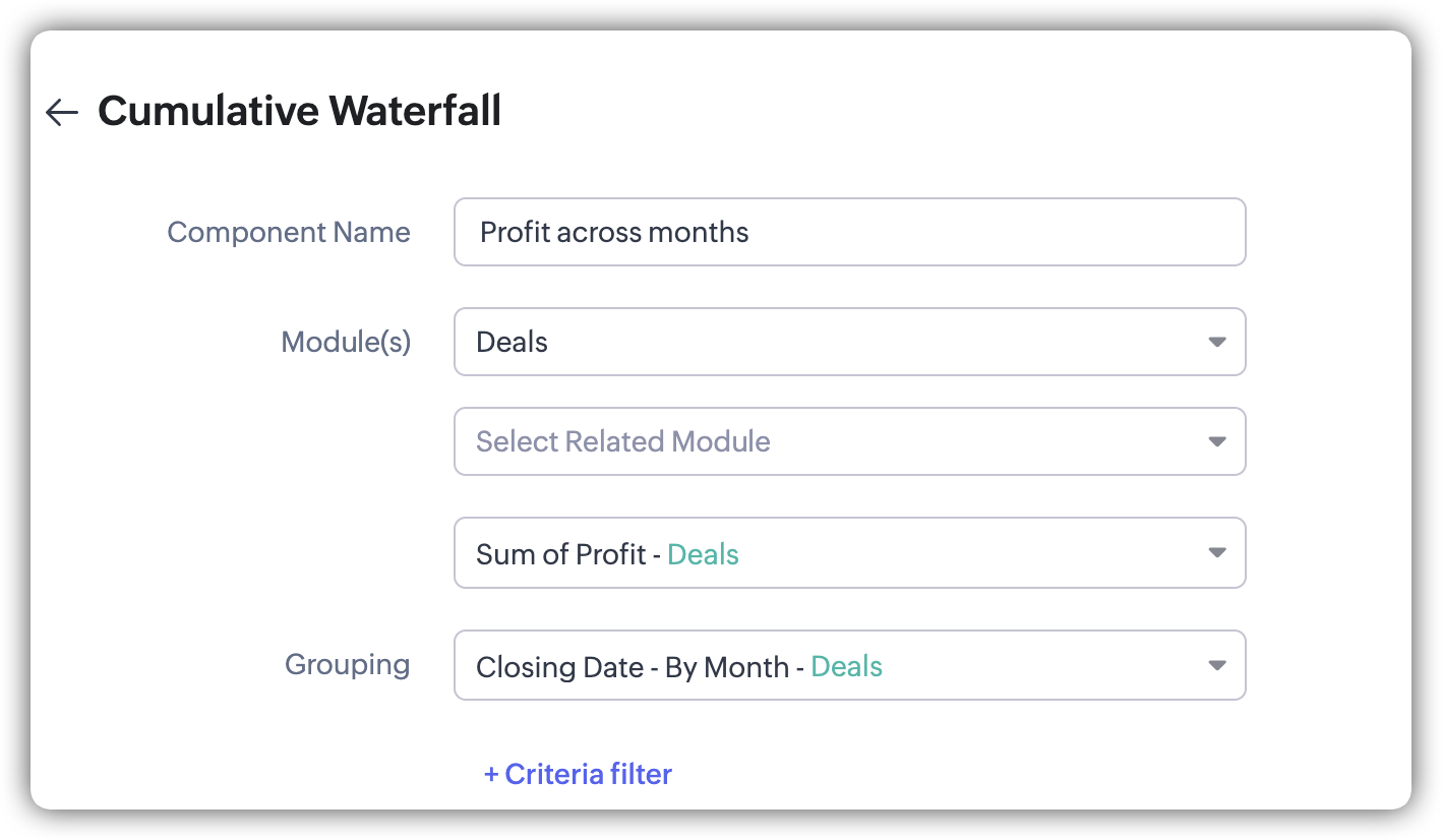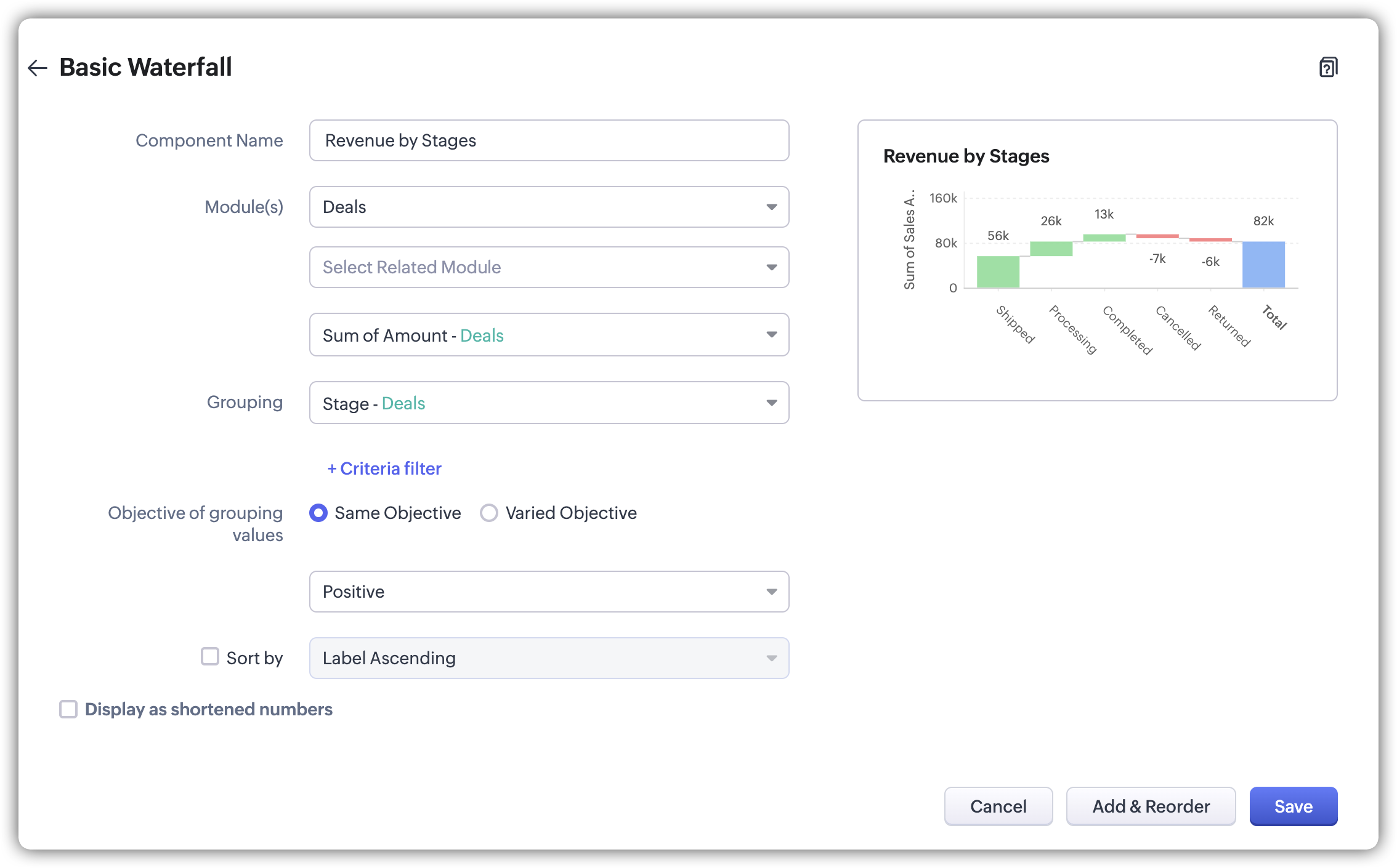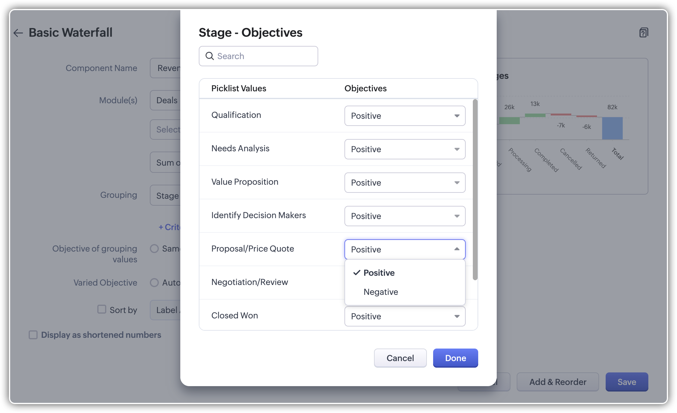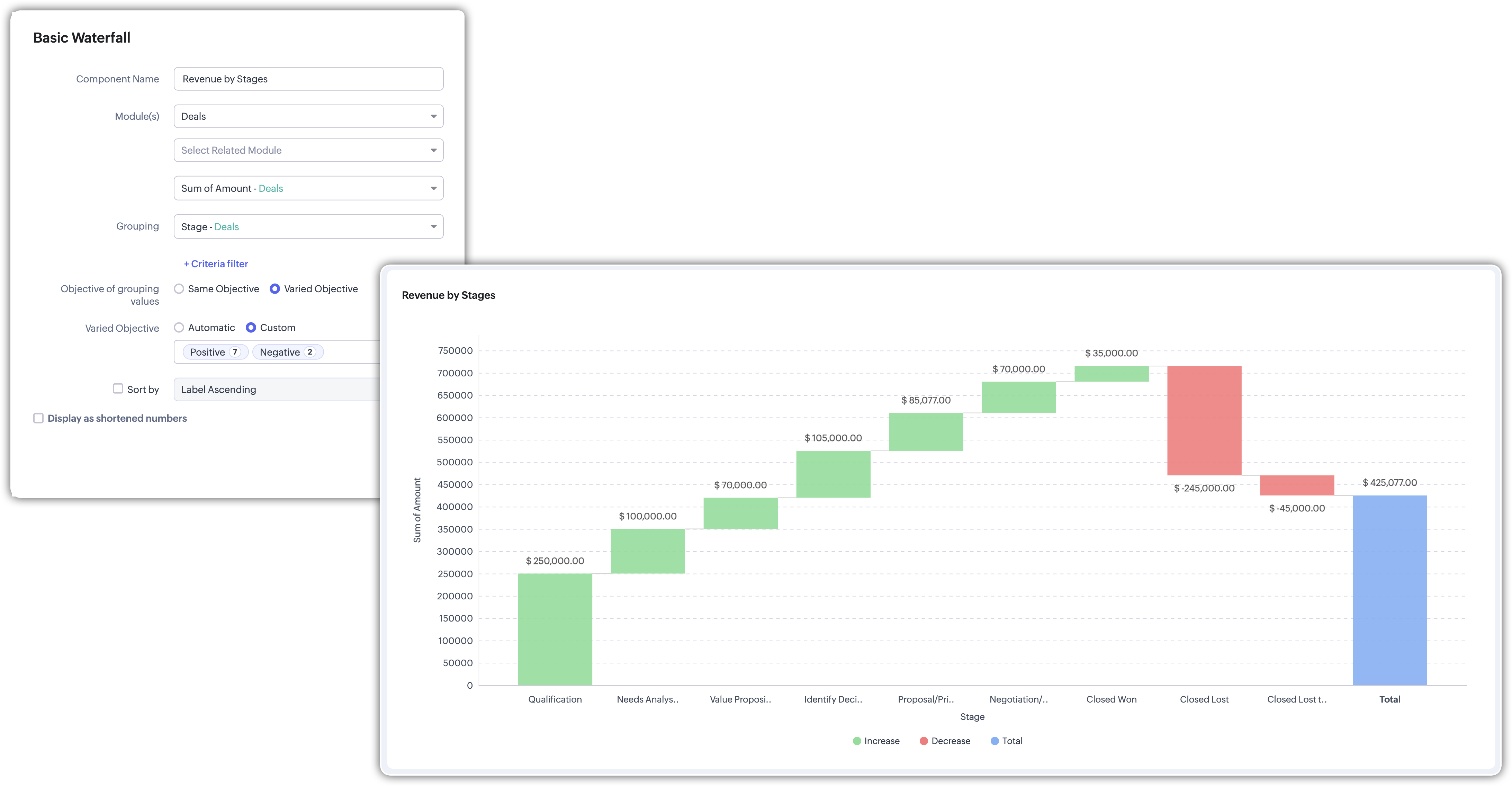 Să presupunem că vrei să înțelegi cum se acumulează sau scade venitul pe diferite etape din pipeline-ul tău de vânzări. O componentă Waterfall care arată venitul pe etapă te ajută să urmărești cum contribuie fiecare etapă la — sau reduce — venitul total.