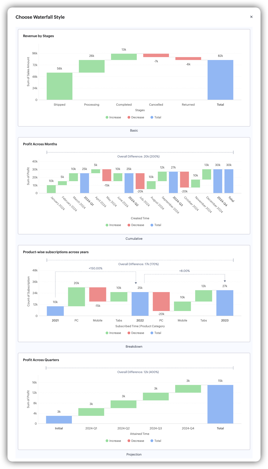 Acest lucru îl face deosebit de util pentru analizarea proceselor precum defalcarea veniturilor, urmărirea cheltuielilor sau orice scenariu în care înțelegerea variației nete dintr-o serie de factori contribuitori este esențială. Vizualizând atât creșterile, cât și scăderile într-un singur flux, componenta Waterfall îți permite să identifici clar unde se adaugă sau se pierde valoare, oferind perspective mai bune și decizii mai bine fundamentate.