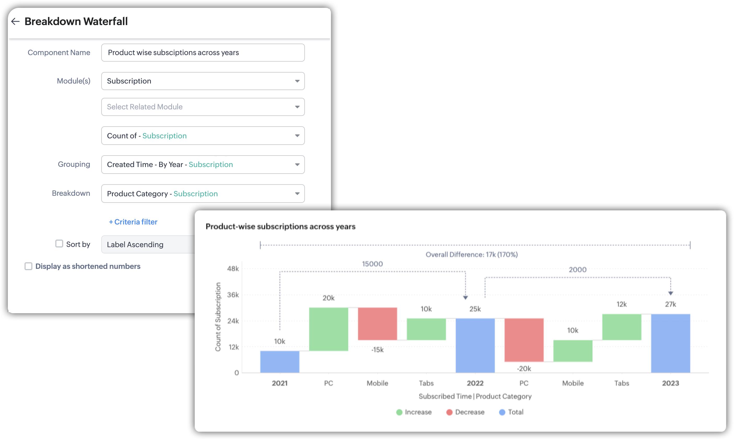 Să presupunem că vrei să compari tendințele de abonare pe produse în ultimii câțiva ani. O componentă Waterfall Defalcare care arată abonamentele pe produse de-a lungul anului și defalcate pe categorii de produse îți oferă o imagine clară a liniilor de produse care au crescut sau scăzut de la un an la altul.