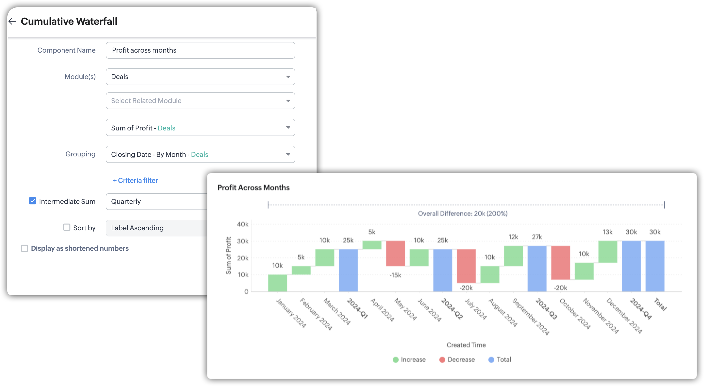 Să presupunem că vrei să monitorizezi cum a crescut sau scăzut profitul în timp. Un Waterfall Cumulativ care arată profitul pe luni, cu sume intermediare trimestriale, te ajută să urmărești modificările de la lună la lună și performanța trimestrială într-o singură vizualizare.