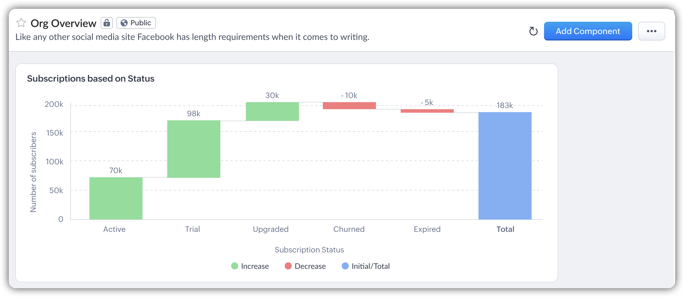 Să presupunem că vrei să înțelegi cum este afectat numărul total de abonați de diferite statusuri de abonament. O componentă Waterfall care arată numărul de abonați pe statusuri precum Activ, Trial, Actualizat, Renunțat și Expirat îți oferă o imagine clară a abonamentului total.