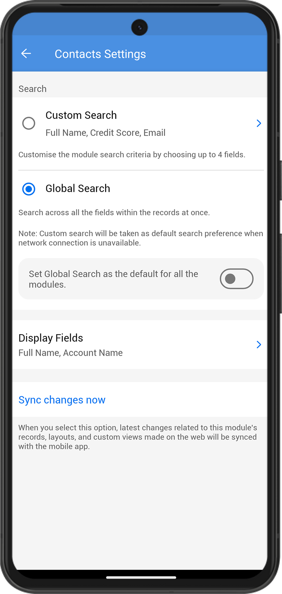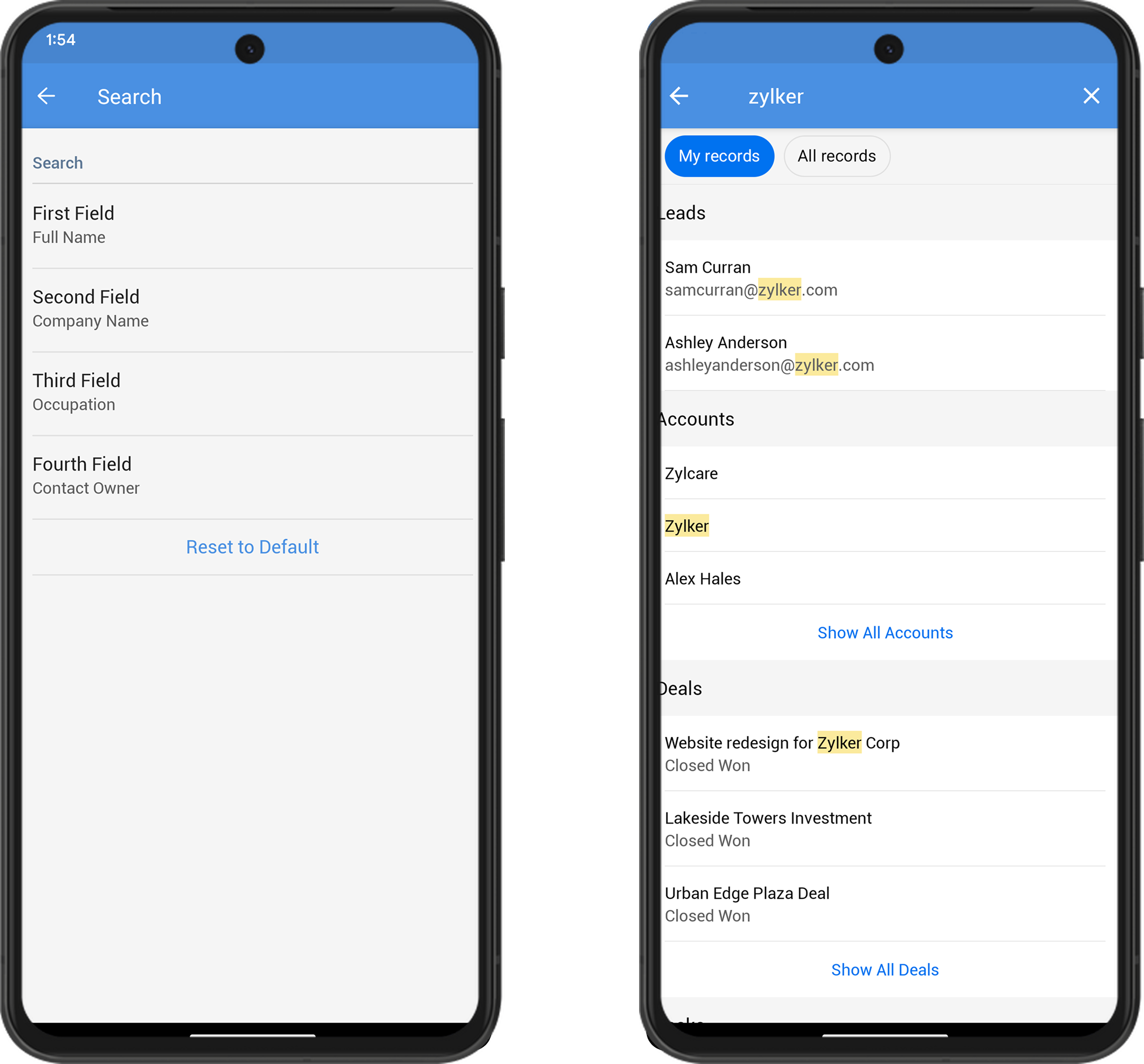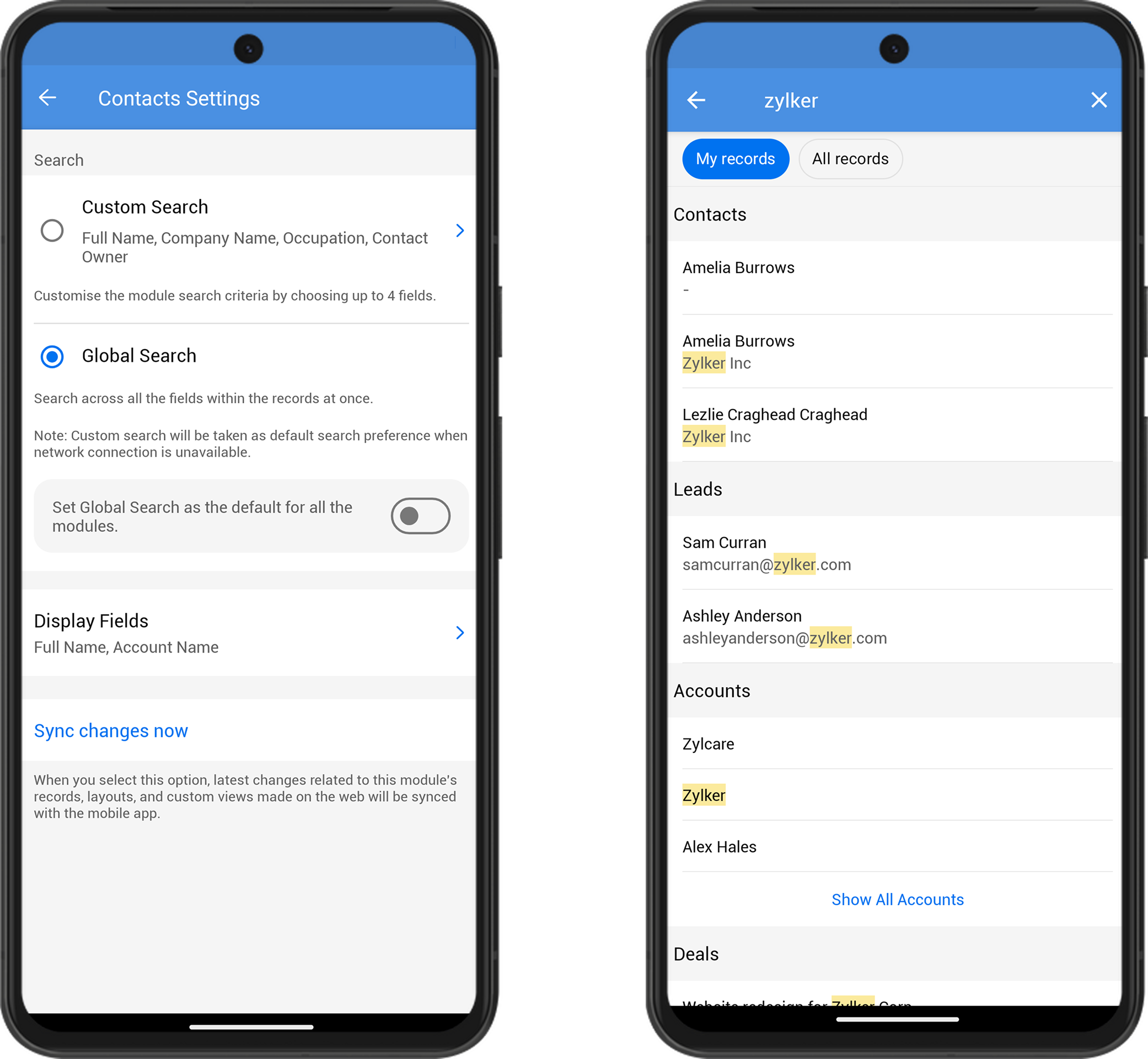 Funcția de căutare din aplicația mobilă Zoho CRM te ajută să găsești rapid înregistrarea exactă pe care o cauți, fără să derulezi prin mai multe intrări. Aplicația acceptă două tipuri de căutare: