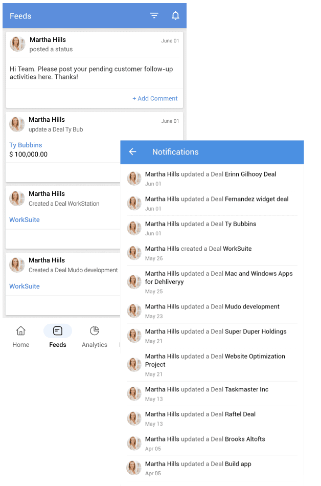 Feeds în Zoho CRM pentru Android îți permite să colaborezi cu colegii tăi și să urmărești activitățile organizației, atât pe ale tale, cât și pe ale colegilor. Feeds îți permite să postezi și să vizualizezi actualizări de stare, să adaugi comentarii, să atașezi fișiere și să filtrezi actualizările pe module.