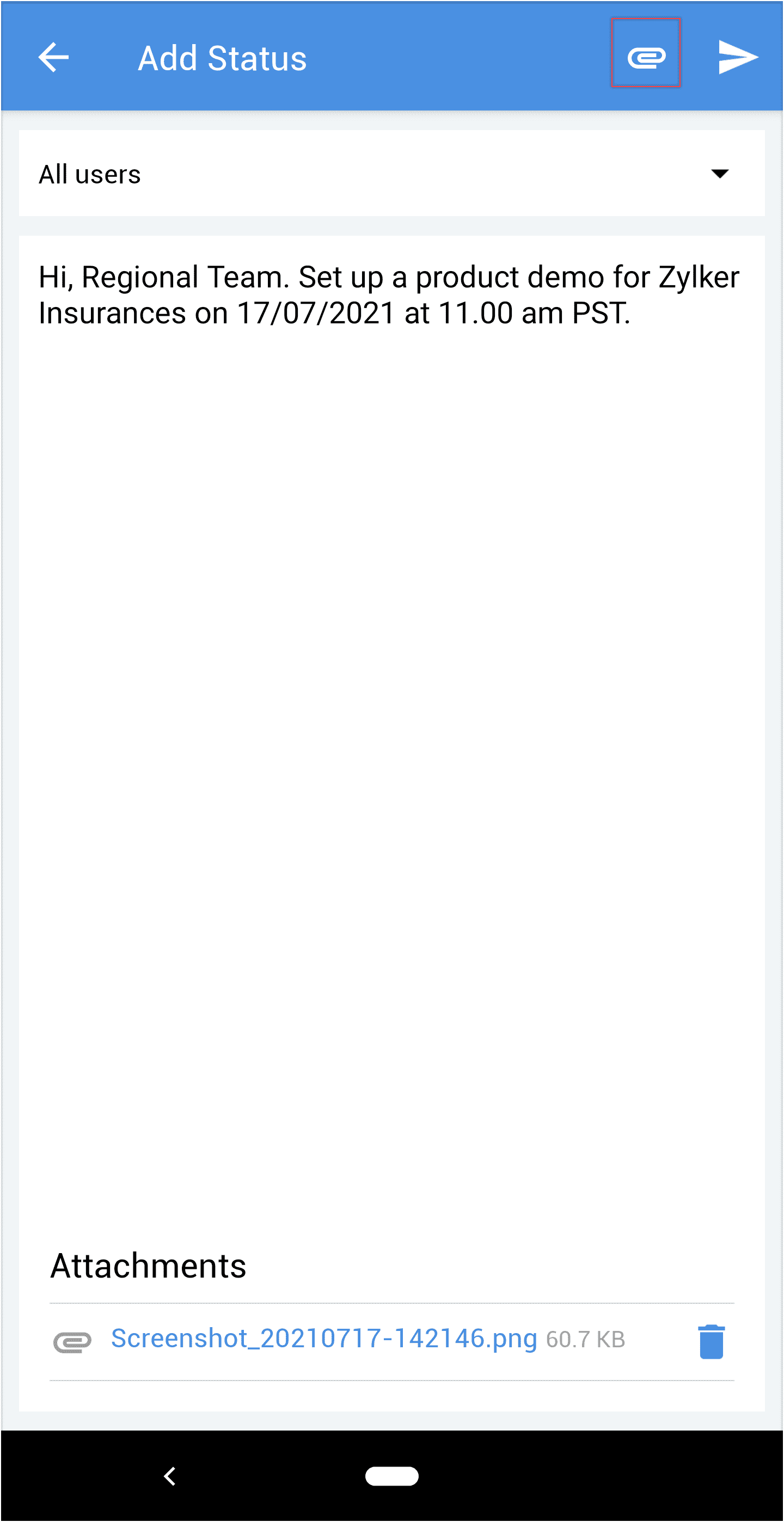 - Apasă pe pictograma de atașament din colțul din dreapta sus pentru a încărca fișiere.