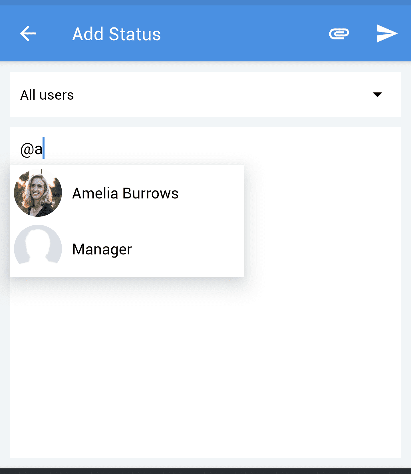 - Pentru a menționa un utilizator, introdu @ și tastează numele lui de utilizator. Alege utilizatorul dorit din lista de nume.