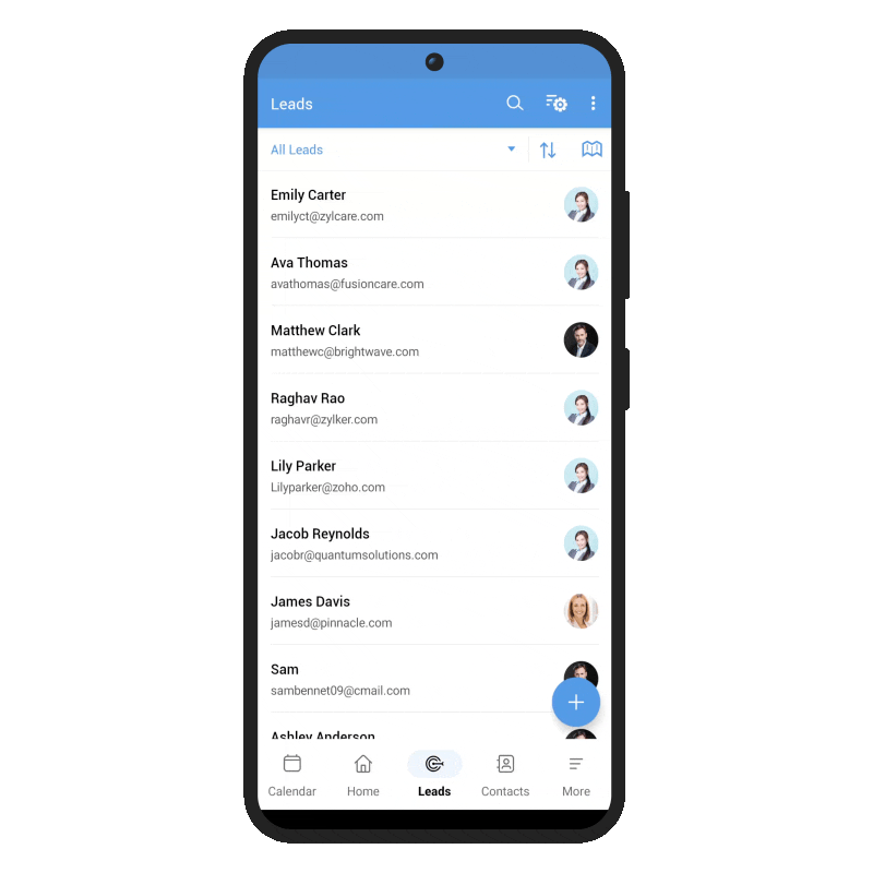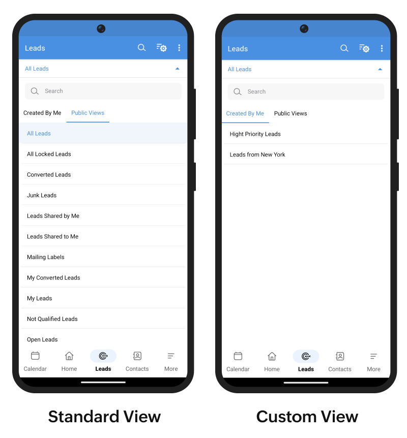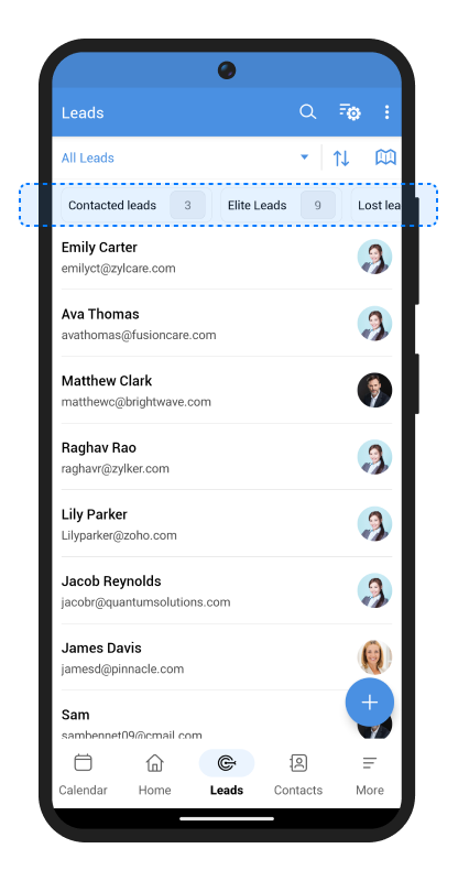 Sfat: După ce creezi o vizualizare personalizată în aplicația web Zoho CRM, reîmprospătează aplicația mobilă pentru a sincroniza modificările.