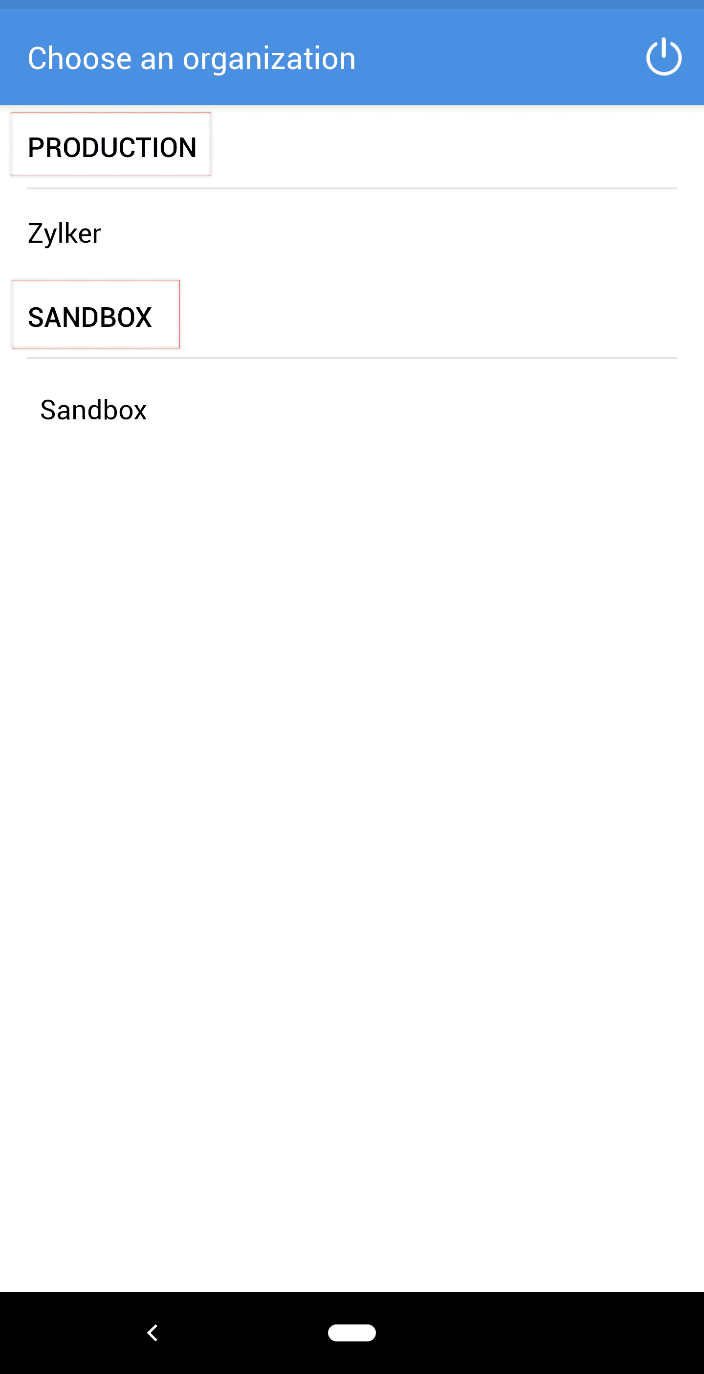 Această opțiune va apărea doar dacă ai fost adăugat la mai mult de o organizație sau sandbox. După ce te-ai conectat la cont, alege organizația CRM și sandbox-ul pe care vrei să le accesezi pe dispozitiv.