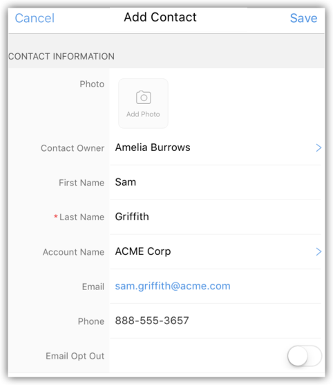 Pentru Lead-uri și Contacte, poți încărca o imagine făcând o fotografie sau folosind o fotografie existentă din Biblioteca de fotografii a iPad-ului.