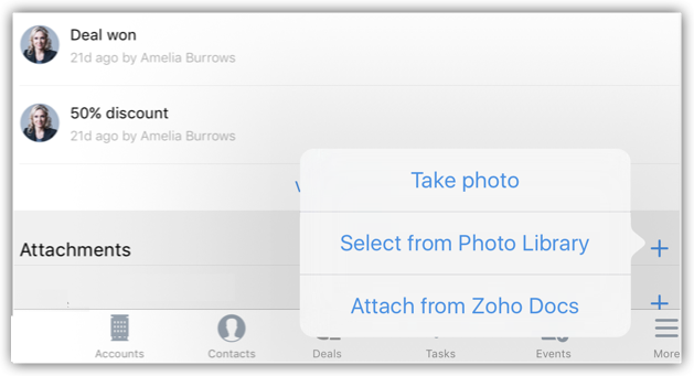 - Alege una dintre opțiunile de încărcare: Takephoto, Selectfrom Photo Library, AttachfromZohoDocs.