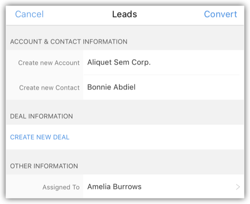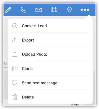 Toate lead-urile din vizualizarea de listă selectată vor fi disponibile. - Selectează o înregistrare și, în ecranul de detalii al înregistrării, apasă pe iconița More Options > Convert Lead.