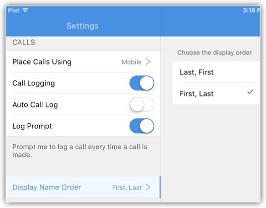 - În ecranul Settings, apasă pe DisplayNameOrder pentru a selecta formatul numelui.