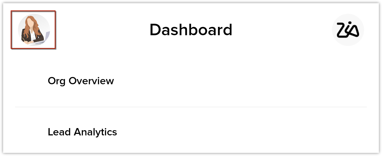 - Apasă pe pictograma Zia din pagina principală a aplicației Zoho CRM Analytics.
