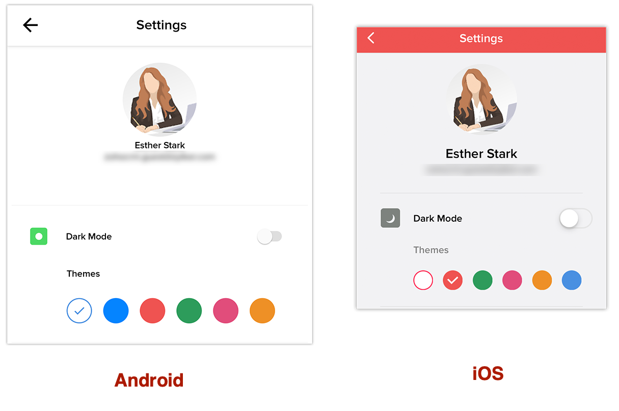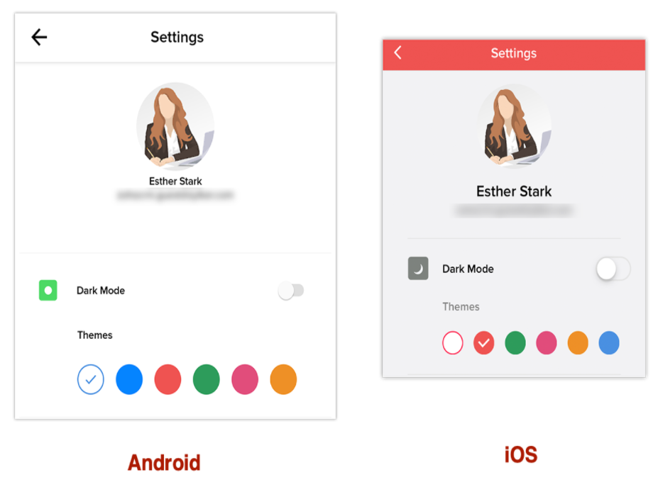 ) de pe dispozitivul iOS. - Activează comutatorul Dark Mode pentru a utiliza aplicația cu fundal negru sau apasă pe o culoare din secțiunea Themes pentru a fi aplicată barei superioare a aplicației.