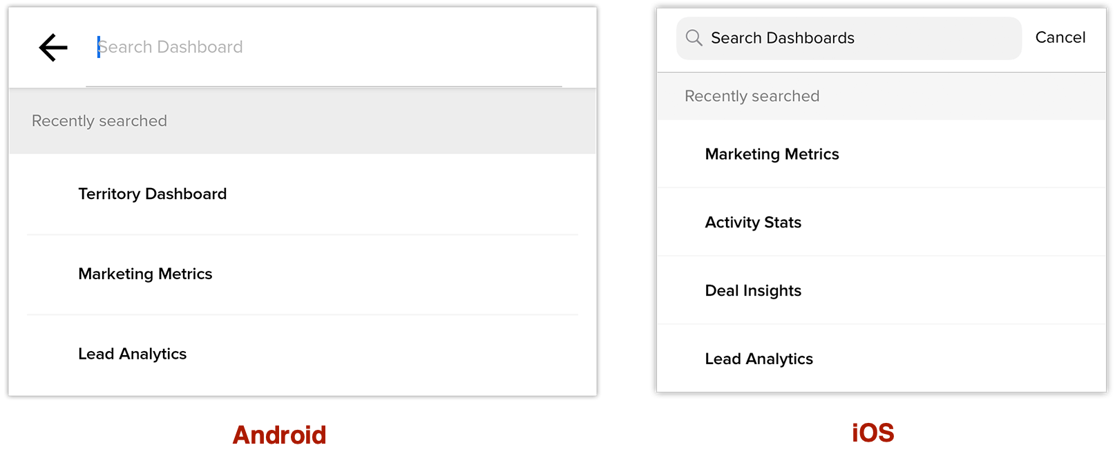 Toate tablourile de bord pe care le-ai căutat și vizualizat recent pot fi accesate apăsând pe pictograma Search. Poți apăsa pe un tablou de bord din listă pentru a-l vizualiza în detaliu.