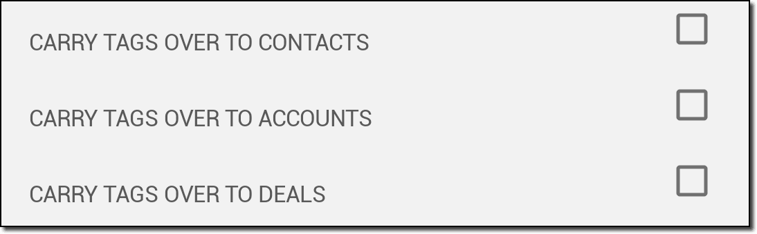 Opțiunea Carry Tags Over To Deals va apărea doar când asociezi o tranzacție cu înregistrarea de lead.
