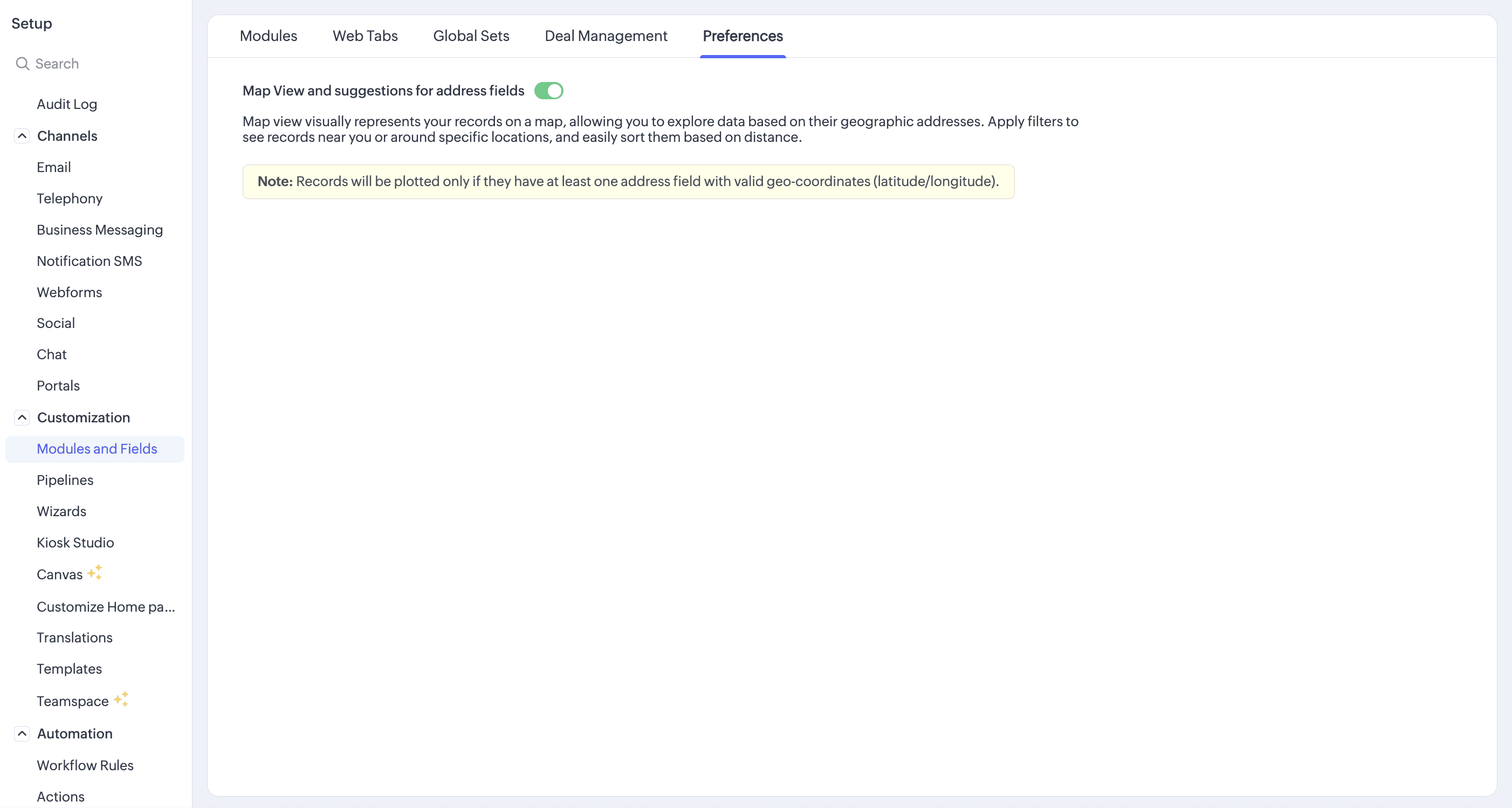 1. Vizualizarea hărții și sugestiile pentru câmpurile de adresă trebuie să fie activate în aplicația web Zoho CRM.