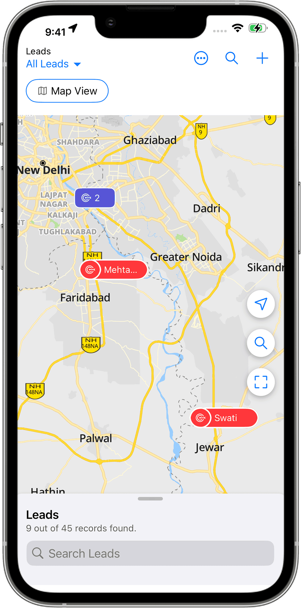Vizualizarea hărții Mappls în aplicația Zoho CRM pentru iOS