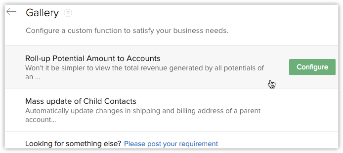 - În pagina Gallery, apasă pe Configure pentru funcția Roll-up Deal Amount to Account.