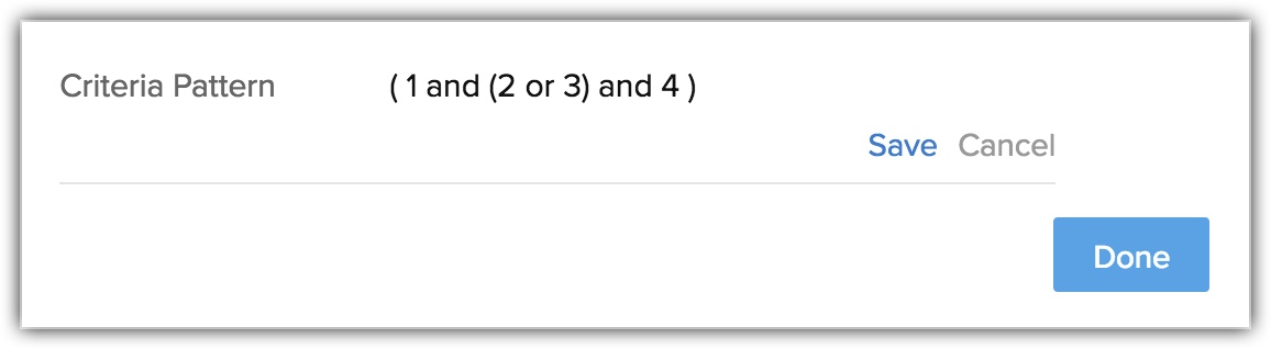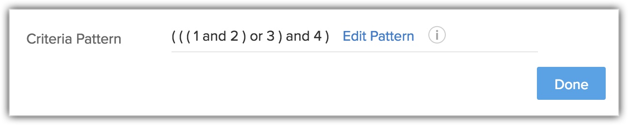 - Dacă adaugi mai multe rânduri în editor și le ștergi pe rând, vor fi afișate paranteze suplimentare în model. De exemplu, dacă sunt adăugate 4 rânduri și ștergi al 3-lea rând, modelul de criterii va fi ( ( ( ( 1 and 2 ) ) ) or 3 ) . Dacă primul rând este șters, atunci va fi afișat ca ( ( ( ( 1 ) ) ) or 2 ) . Totuși, la salvarea criteriului, se va schimba în ( 1 or 2 ) .
