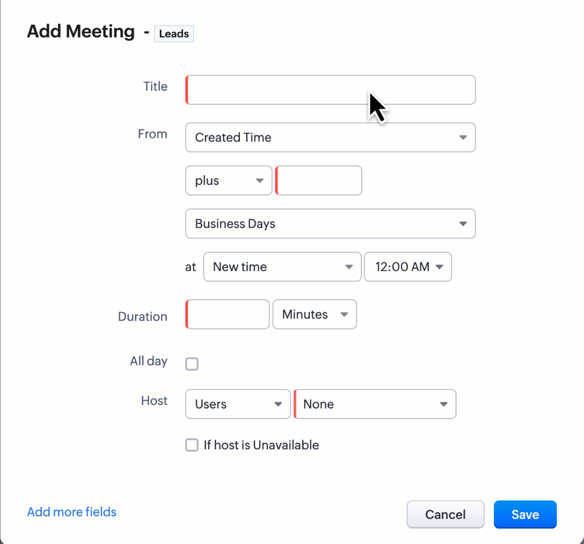 Este posibil să vrei să primești un memento prin email cu o săptămână înainte de data estimată de închidere a unei tranzacții sau să vrei să trimiți un email clienților pentru a le reaminti despre chiriile lunare sau reînnoirile de abonament. În aceste cazuri, nu este necesar ca înregistrările să fie create sau editate pentru ca regula să fie declanșată. Se bazează pur și simplu pe valoarea din câmpurile de dată. Această opțiune de execuție îți permite să alegi un câmp de dată dintr-o înregistrare și să definești ziua în care regula trebuie declanșată.