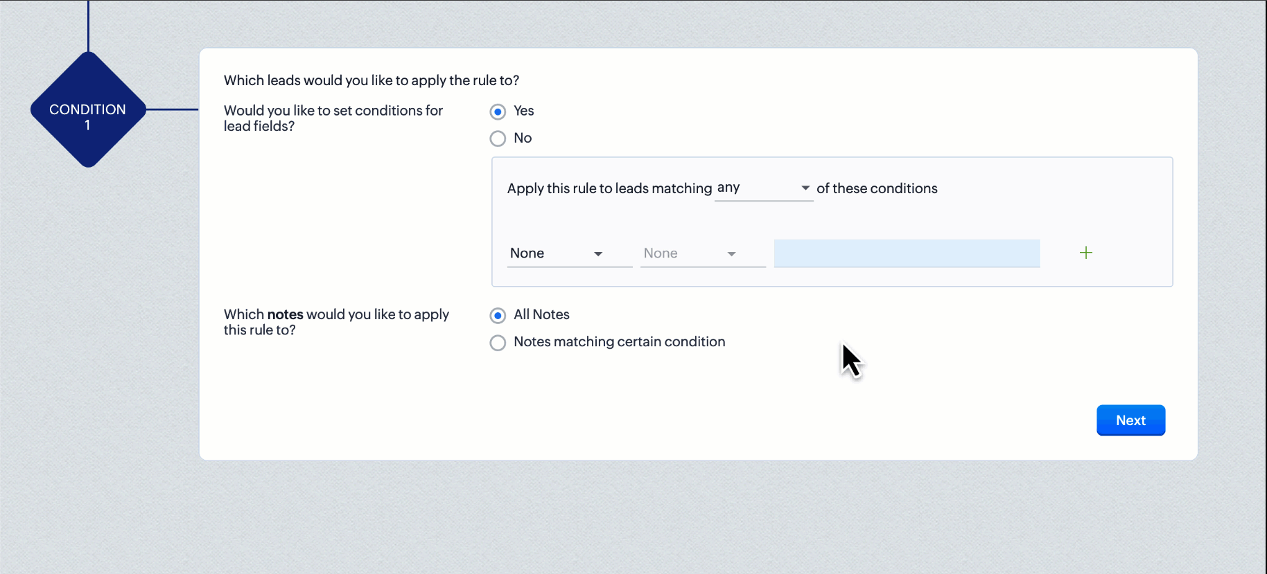 - Din lista derulantă pentru când să se execute regula de flux de lucru, selectează Record Notes .