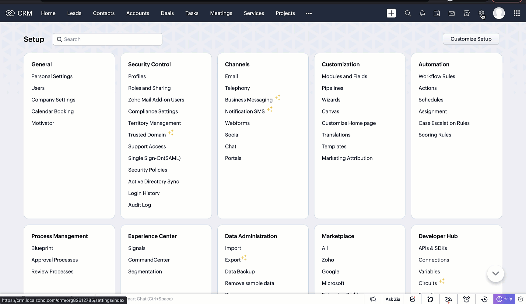Module - Leads, Contacts, Accounts, Deals și module personalizate.