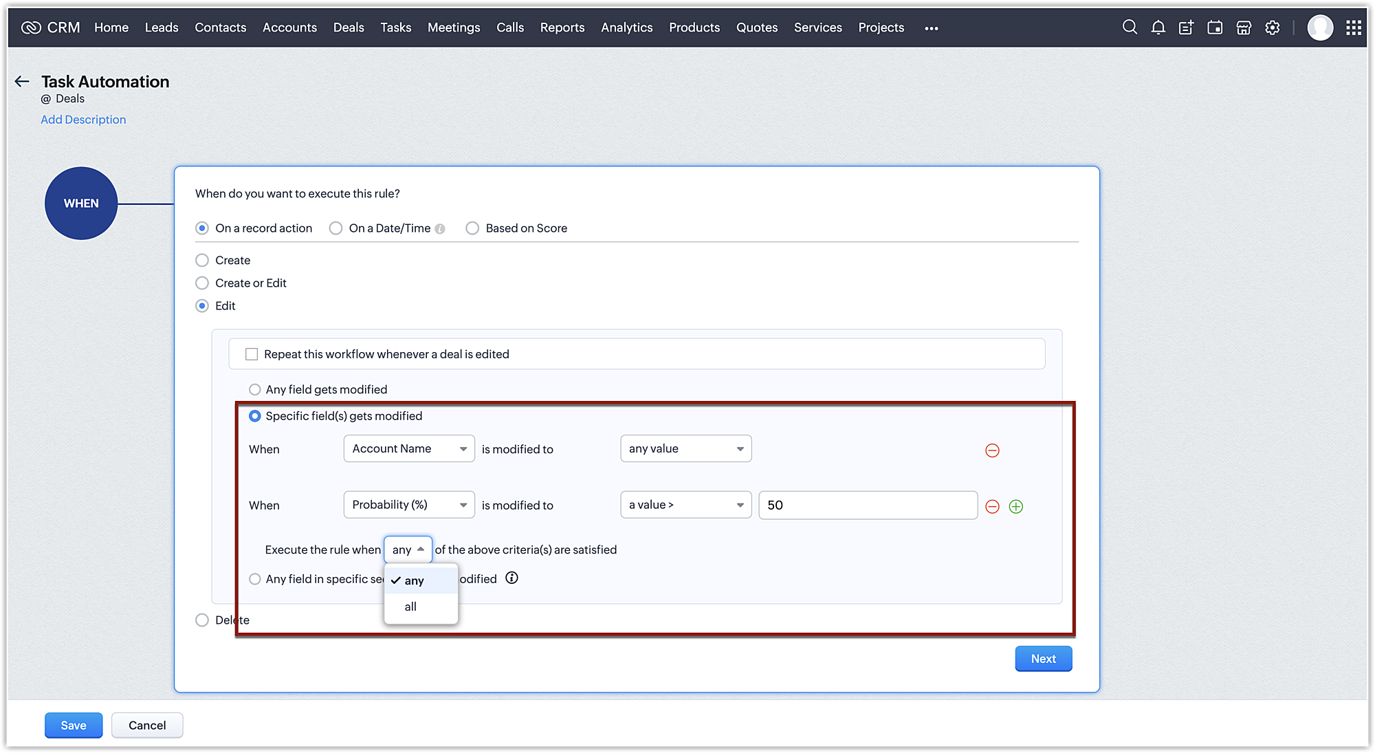 - Any field gets modified: Execută regula când orice înregistrare existentă este modificată.
