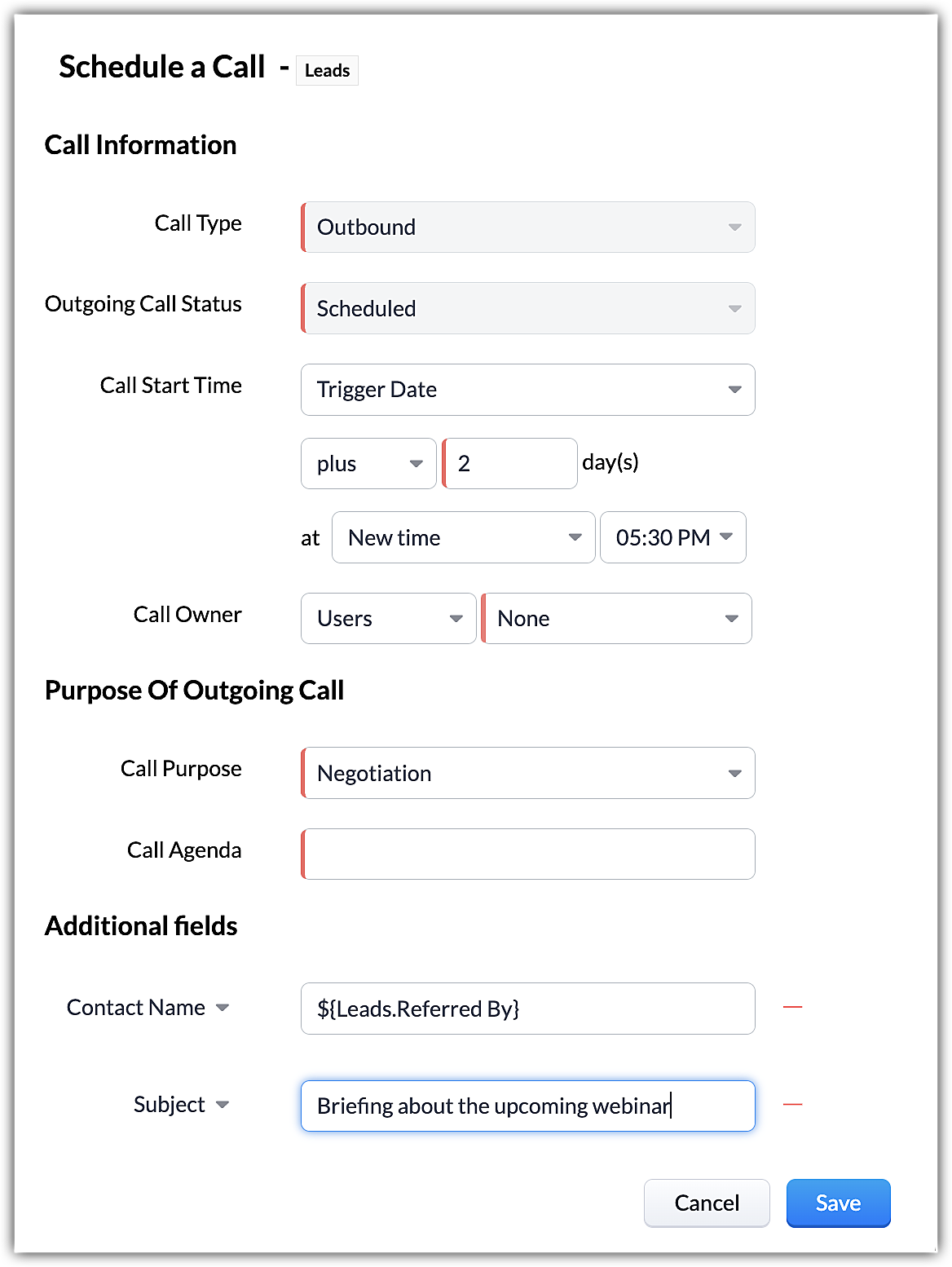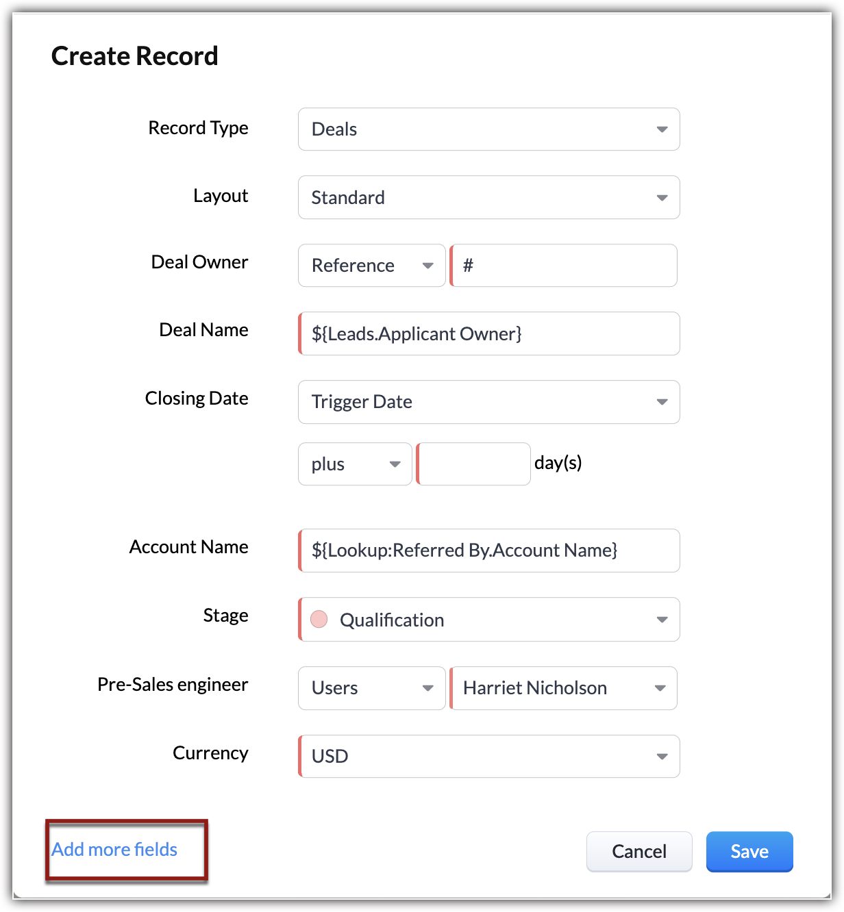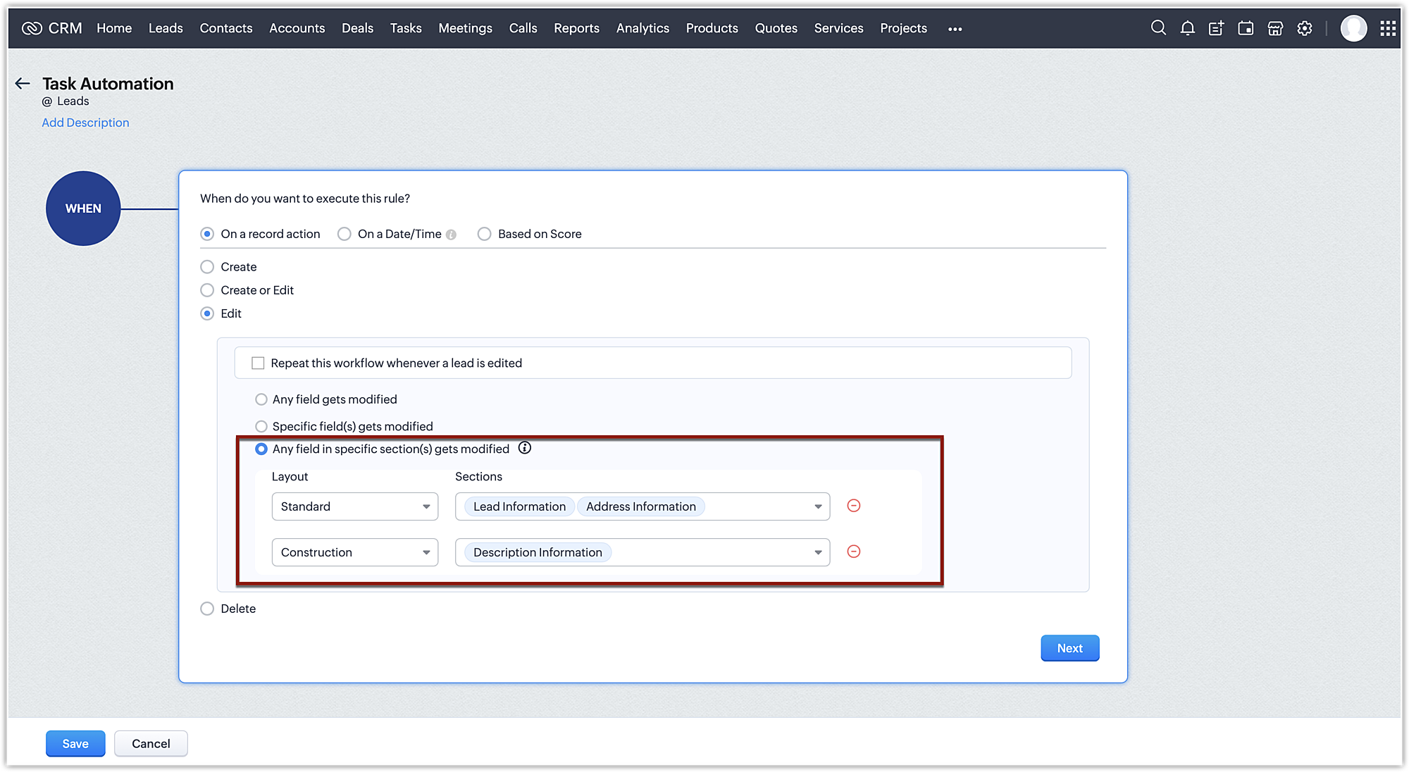 Când sunt create lead-uri noi în Zoho CRM, este posibil să vrei să trimiți automat un email sau o serie de emailuri la intervale stabilite. De asemenea, ai putea vrea să creezi sarcini pentru aceste lead-uri noi. Totodată, uneori când câmpuri specifice sunt actualizate, ai putea vrea să declanșezi un flux de lucru. Această opțiune de execuție îți permite să specifici o acțiune (Creare, Editare, Ștergere etc.) pe baza căreia regulile de flux de lucru vor fi declanșate.