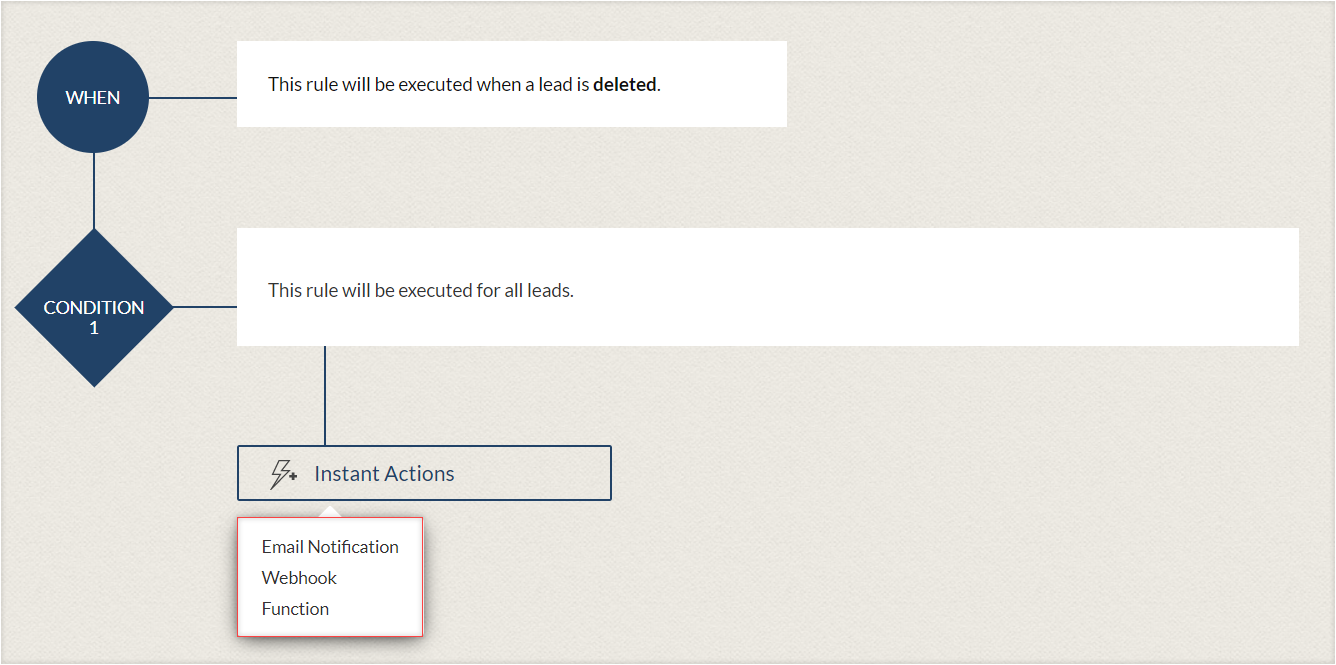 - Acțiuni instantanee - Adaugă notificări prin email, sarcini, actualizări de câmpuri, webhook-uri, funcții personalizate, creare de înregistrări și trimitere de notificări prin Cliq, Slack sau Cisco Webex care vor fi declanșate imediat când regula este executată. La acțiunile de editare sau actualizare a câmpurilor, poți de asemenea converti Lead-uri, Oferte sau Comenzi de vânzare.