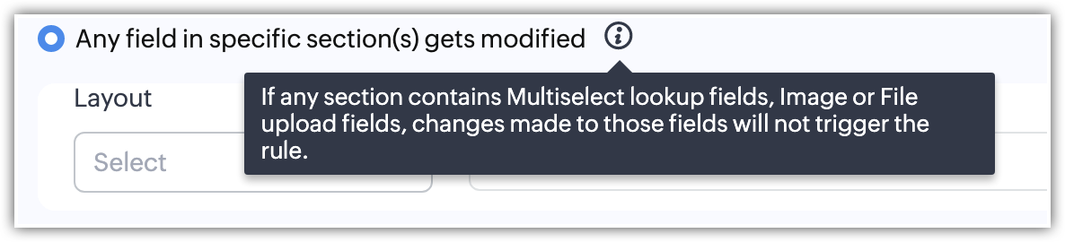 - Dacă un câmp din secțiunea specificată conține câmpuri Multiselect lookup, Image sau File upload, modificările făcute acelor câmpuri nu vor declanșa regula.