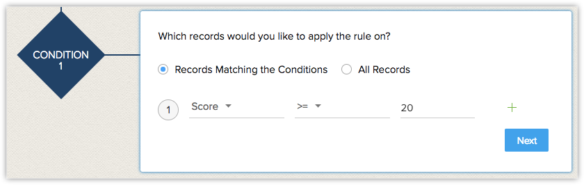 Regulile pot fi declanșate când scorul unei înregistrări este crescut, scăzut sau actualizat. De exemplu, lead-urile din industria de servicii sunt prospecții tăi principali și vrei să le prioritizezi pe baza scorurilor. Ai putea vrea să urmărești îndeaproape lead-urile care au un scor de 10 sau mai mult. În astfel de cazuri, poți crea o regulă de flux de lucru bazată pe scoruri. Când scorul unui lead este actualizat și dacă scorul este 10 sau mai mult, poate fi creată o sarcină pentru a prioritiza și urmări lead-ul imediat.
