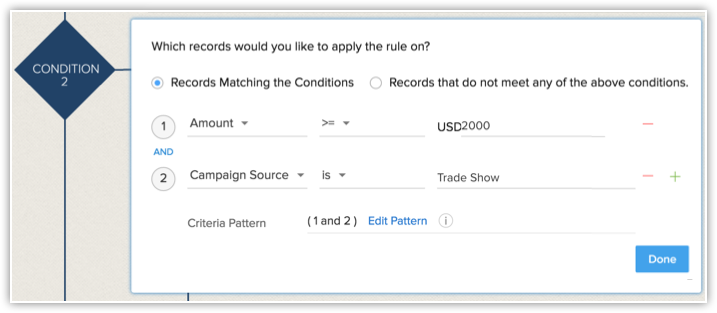 - Condiție flux de lucru - Poți crea mai multe condiții într-o regulă de flux de lucru. Fiecare condiție constă din două elemente. Unul specifică ce înregistrări trebuie declanșate, adică toate înregistrările sau înregistrările care corespund criteriilor. Celălalt adaugă criteriile pe baza cărora trebuie declanșată. Când există mai multe condiții, înregistrările vor fi validate conform criteriilor menționate în fiecare condiție și când îndeplinește un criteriu, celelalte condiții care urmează vor fi ignorate pentru validare. Următoarele opțiuni te ajută să definești înregistrările care trebuie declanșate.