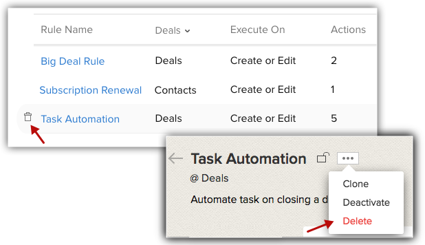 Poți de asemenea să ștergi regulile de workflow din vizualizarea de tip listă și, de asemenea, în timp ce vizualizezi regula. Când ștergi o regulă de workflow, toate acțiunile programate pentru înregistrări vor fi de asemenea șterse.