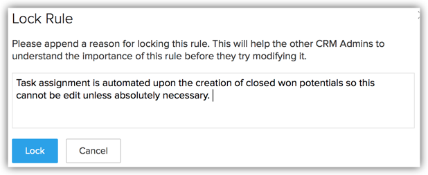 - În Blocare regulă , introdu motivul blocării regulii. Acest mesaj va fi afișat celorlalți administratori care încearcă să deblocheze regula pentru editare.
