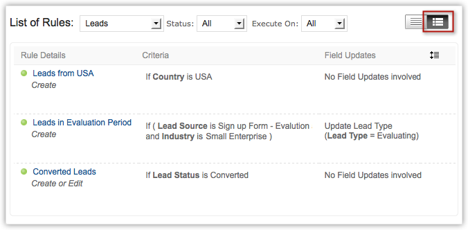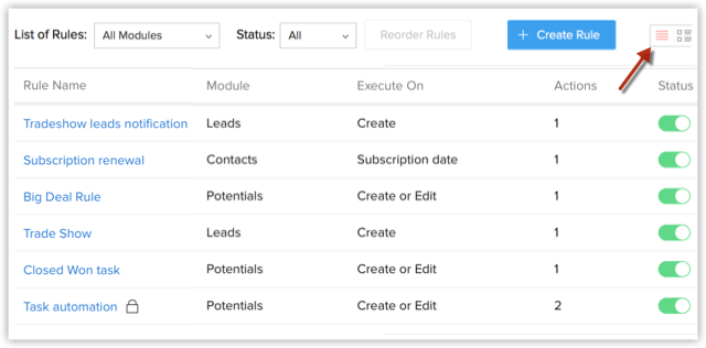 Există două vizualizări pentru regulile de workflow create - Vizualizarea de tip listă și Vizualizarea sumară . Implicit, vei vedea vizualizarea de tip listă, care este o listă a tuturor regulilor de workflow pentru Toate modulele/Modulul selectat.