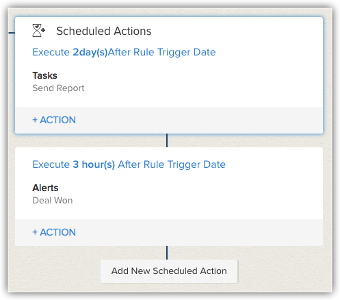 - Acțiuni programate - Adaugă notificări prin email, sarcini, actualizări de câmpuri, webhook-uri, funcții personalizate și trimitere de notificări prin Cliq, Slack sau Cisco care vor fi programate și declanșate pe baza unui timp specificat.