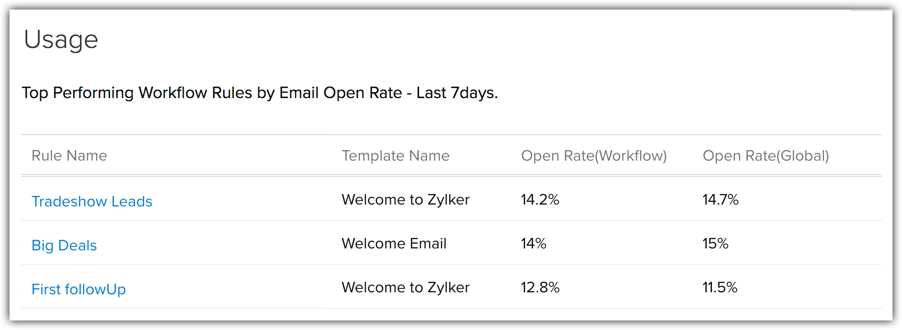 Poți vedea statistici privind utilizarea regulilor tale de workflow care au acțiunea de trimitere a notificărilor prin email asociată. Pe baza ratei de deschidere a șablonului de email asociat regulilor tale de workflow, cele mai performante reguli de workflow sunt listate în fiecare săptămână.