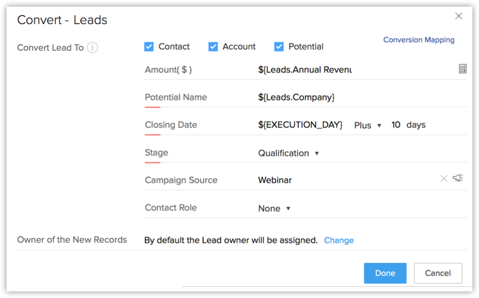 Într-o regulă de flux de lucru pentru leaduri, câmpurile tranzacției vor fi listate. Câmpurile obligatorii vor fi precompletate pe baza Mapării de conversie. - Completează câmpurile pentru tranzacții. Poți fie să specifici o valoare, fie să folosești câmpuri de îmbinare pentru a adăuga o variabilă pentru câmpurile tranzacției.